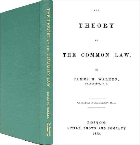 1998. ISBN-13: 9781886363458; ISBN-10: 1886363455. Walker, James. The Theory of the Common Law. Boston: Little, Brown and Co., 1852. [iv], vi, 130 pp. Reprinted 1998 by The Lawbook Exchange, Ltd. ISBN-13: 9781886363458; ISBN-10: 1886363455. Cloth. New. $65. * Reprint of the rare first and only edition of an original essay written by a successful lawyer and accomplished scholar from South Carolina, comparing Roman law and common law. Untypical of most American practitioners at this time, Walker had a deep interest in Roman law, which is reflected here in numerous comparative references and in an earlier book by Walker on Roman law. Walker (1813-1854) was a graduate of the University of South Carolina and a member of the South Carolina bar; He published three books before his premature death at 41.