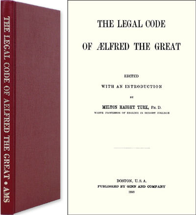 1973. Aelfred, King of Wessex [CE 871-899]. Turk, Milton Haight, Editor. The Legal Code of Aelfred the Great. Edited With an Introduction. Boston: Published by Ginn and Company, 1893. Reprint. New York: AMS Press, [1973]. viii, 147 pp. Hardcover. Maroon cloth with gilt spine lettering. As new. $15. * This edition contains the complete text of the code with full scholarly apparatus and an extensive introduction that discusses manuscripts of the code, philological issues and the code's legal and literary qualities.