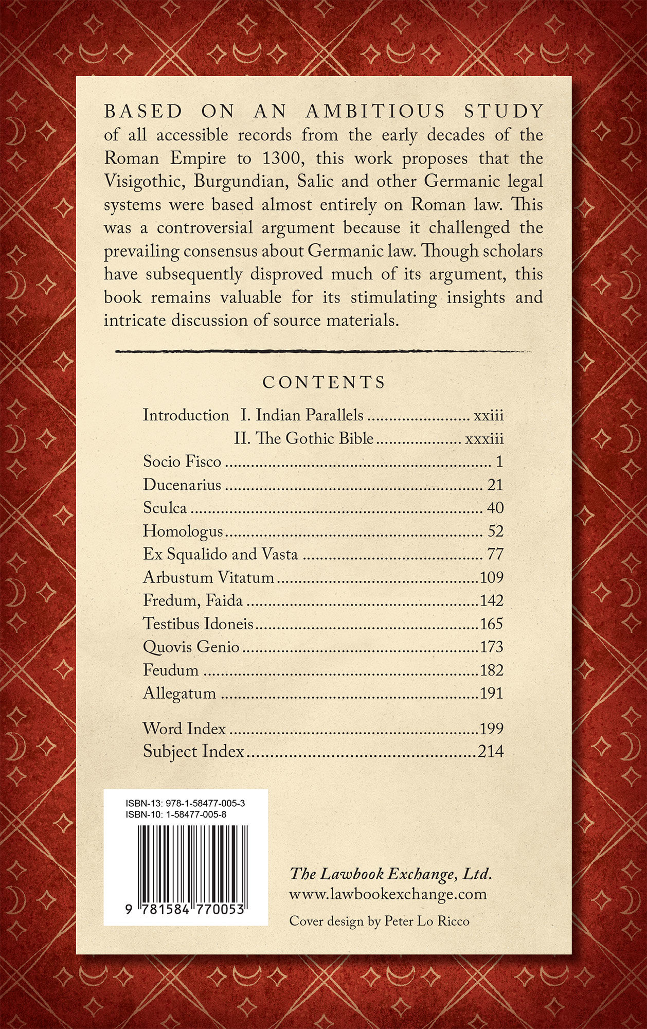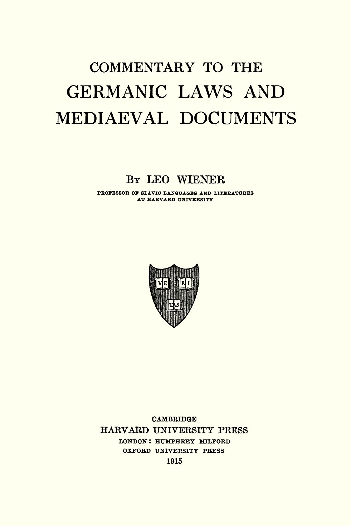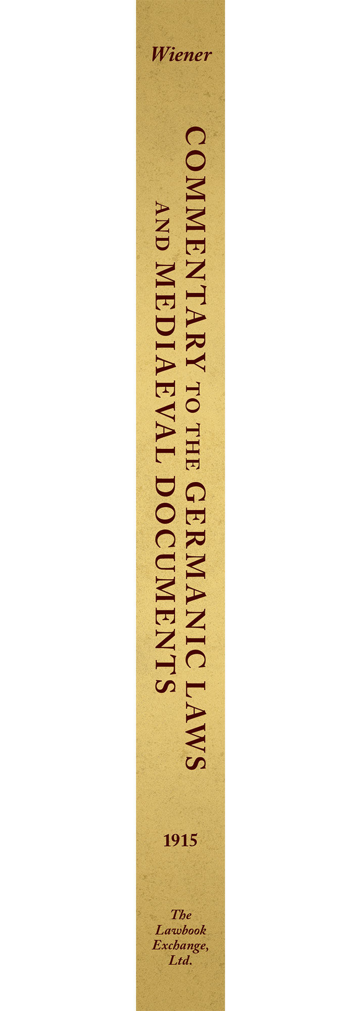 2000. ISBN-13: 9781584770053; ISBN-10: 1584770058. Wiener, Leo. Commentary to the Germanic Laws and Mediaeval Documents. Cambridge: Harvard University Press, 1915. lxi, 224 pp. Reprinted 2000 by The Lawbook Exchange, Ltd. ISBN-13: 9781584770053. ISBN-10: 1584770058. Hardcover. New. $39.95 * Based on an ambitious study of all accessible records from the early decades of the Roman Empire to 1300, this work proposes that the Visigothic, Burgundian, Salic and other Germanic legal systems were based almost entirely on Roman law. This was a controversial argument because it challenged the prevailing consensus about Germanic law. Though scholars have subsequently disproved much of its argument, this book remains valuable for its stimulating insights and intricate discussion of source materials.