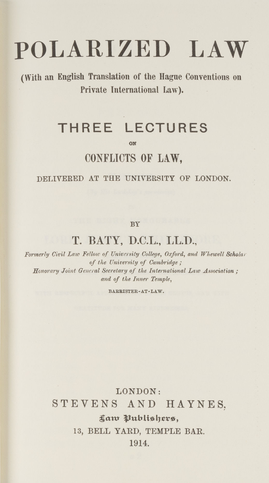 1986. Baty, T[homas]. Polarized Law (With an English Translation of the Hague Conventions on Private International Law). Three Lectures on Conflicts of Law, Delivered at the University of London. London: Stevens and Haynes, 1914. Reprint. Littleton: Fred B. Rothman & Co., 1986. xv, 210 pp. Cloth. New. $35.