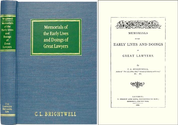 2002. ISBN-13: 9781584772361; ISBN-10: 1584772360. Brightwell, C.L. Memorials of the Early Lives and Doings of Great Lawyers. Originally published: London: T. Nelson and Sons, 1866. 251 pp. Reprinted 2002 by The Lawbook Exchange, Ltd. ISBN-13: 9781584772361; ISBN-10: 1584772360. Attractive smyth-sewn blue cloth hardcover with gilt stamped spine label and front cover. New. $65. * Includes sketches of Sir Thomas More, Sir Edward Coke, Sir Matthew Hale, Lord-Keeper Guildford, Chief Justice Holt, Lord Mansfield, Sir J. Eardley Wilmot, Sir William Blackstone, Lord Erskine, Lord Ellenborough, Lord Eldon, Sir Samuel Romilly and Lord Tenterden. The argument of this charming collection of biographical sketches is outlined in its preface: "In this little volume will be found a series of short biographical notices of some of our most renowned English lawyers, having reference principally to the earlier period of their lives, and occasionally detailing a few of their more remarkable 'sayings and doings.' (...) This work, designed as a school-prize book, will, it is hoped, stir the mind of many a youth to emulate the worthy example and tread in the footsteps of the eminent men who have from age to age filled the highest places in our Courts of Juridicature, and who are among the greatest benefactors and brightest ornaments of our nation." Preface.