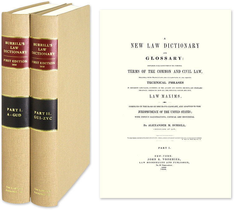 1998. ISBN-13: 9781886363328; ISBN-10: 1886363323. Burrill, Alexander M. A New Law Dictionary and Glossary: Containing Full Definitions of the Principal Terms of the Common and Civil Law, Together with Translations and Explanations of the Various Technical Phrases in Different Languages, Occurring in the Ancient and Modern Reports, and Standard Treatises; Embracing Also All the Principal Common and Civil Law Maxims. Compiled on the Basis of Spelman's Glossary, and Adapted to the Jurisprudence of the United States; with Copious Illustrations, Critical and Historical. Originally published: New York: John S. Voorhies, 1850-1851. 2 volumes. xviii, 1099 pp. Reprinted 1998 by The Lawbook Exchange, Ltd. ISBN-13: 9781886363328; ISBN-10: 1886363323. Hardcover. New. $150. * Reprint of the first edition. A scarce, important original American dictionary by a student of James Kent. Burrill [1807-1869] was admitted to the New York Bar in 1828. Burrill was highly regarded for his legal scholarship. Dictionary of American Biography describes this as "a work of very high standard, which at once took its place as perhaps the best book of its kind so far produced...All his books were distinguished for their graceful style and a scholarly precision and finish which earned the unstinted commendation of the judiciary. In addition their accuracy of statement and definition was fully recognized at the time by the profession at large" (II:326).