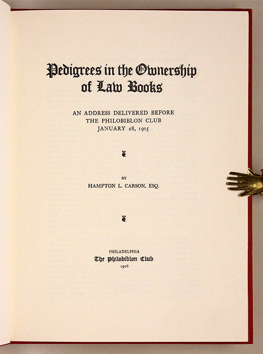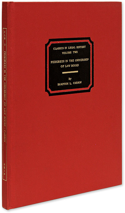 1968. Carson, Hampton L. Pedigrees in the Ownership of Law Books. An Address Delivered Before the Philobiblon Club January 28, 1915. Philadelphia: The Philobiblon Club, 1916. 32 pp. Reprint W.S. Hein, [1968]. Classics in legal history series vol. 2. Publisher's red cloth with gilt stamped front cover and spine. Hardcover. As new, excellent condition. $25.