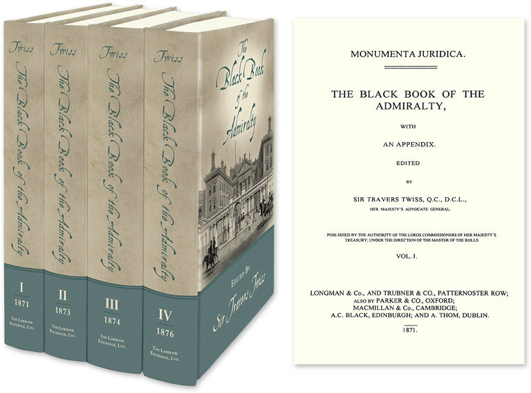 2011. ISBN-13: 9781886363397; ISBN-10: 1886363390. The Origins of Maritime and International Law [Twiss, Sir Travers]. The Black Book of the Admiralty, with an Appendix. Monumenta Juridica. Edited by Sir Travers Twiss. Originally published: London: Longman & Co., 1871. 4 volumes. 4, xciii, 491, [2]; 4, lxxxvii, 500, 31; 4, lxxxvi, 673, [1], 31; 4, clii, 559, 32 pp. Reprinted 1998, 2011 by The Lawbook Exchange, Ltd. ISBN-13: 9781886363397. ISBN-10: 1886363390. Hardcover. New. $210. * The earliest records of the court of Admiralty portray the origins of maritime law. Due to the court of Admiralty's jurisdiction over commercial contracts and foreign trade, they also record the origins of modern international law. Collected by an official of the Admiralty during the reign of Henry VI, The Black Book of the Admiralty contains documents from many sources. It includes regulations regarding the criminal jurisdiction of the Admiralty, the rights of the crown, the Admiralty droits, material relating to rights, wages, prizes, merchant contracts, collisions and inquests, a tract on the ordo judiciorum illustrating the court's model from civil rather than common law procedure and the inquisition taken at Queensborough in 1375. This edition also contains the laws of Oleron with eleven additional rules and an appendix of documents that includes the statutes of Richard II and Henry IV concerning Admiralty jurisdiction. Sir Travers Twiss [1809-1897] was Professor of Political Economy in the University of Oxford, Professor of International Law in King's College, London and Regius Professor of Civil Law at Oxford. In 1862 he was appointed Advocate-General to the Admiralty, and in 1867 Queen's Advocate-General, the same year he was knighted.