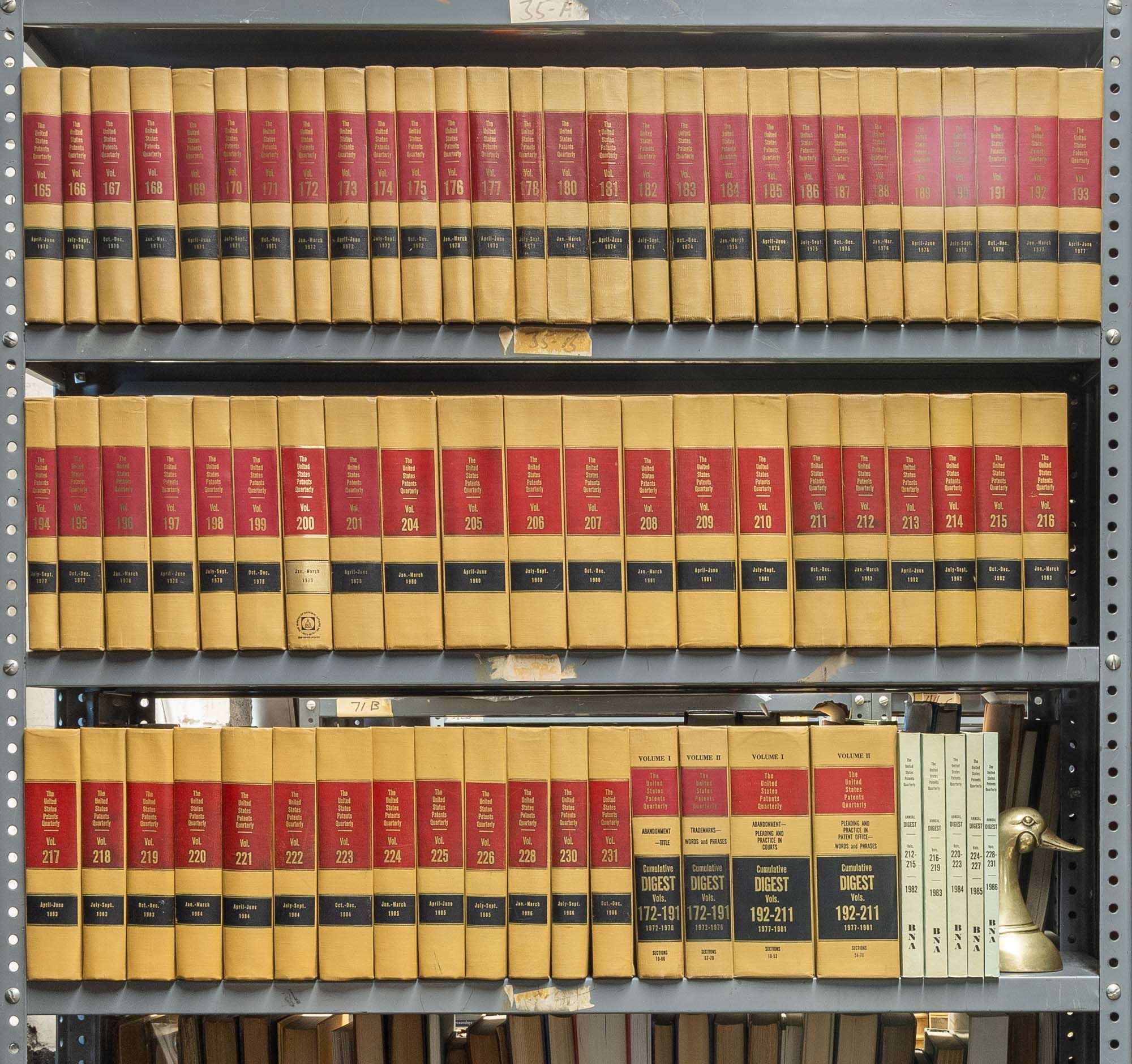 1999. United States Patents Quarterly [1st]. Washington: Bureau of National Affairs. 62 Volumes (1970-1986). Volumes 165-178, 180-201; 204-226, 228, 230, 231, in 62 books. USPQ 1st Cumulative Digest Index vols. 172 to 211 in 4 books, volumes 212 to 231, in 5 original paper issues. Together 71 books. Ten (10) linear feet shlef space. Ex-private law firm library with stamps on inside covers. Special $295. Premier research tool on Intellectual Property law and indispensable in a patent library. Unique in that it prints many "manuscript" decisions which are nowhere else published. These Patent Office decisions are not printed in the Commissioner's decisions, but are often referred to by the examiners. The publisher is permanently out-of-print of 17 volumes of this title.