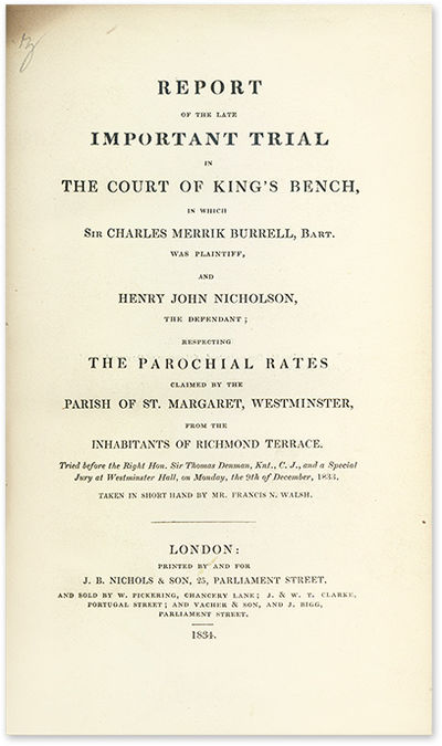 1834. London: J.B. Nichols & Son, 1834. Only edition. London: J.B. Nichols & Son, 1834. Only edition. Interesting Trial Concerning Responsibility for Poor Relief [Trial]. Nicholson, Henry John, Defendant. Report of the Late Important Trial in the Court of King's Bench, In Which Sir Charles Merrik Burrel, Bart. Was Plaintiff, And Henry John Nicholson, the Defendant; Respecting the Parochial Rates Claimed by the Parish of St. Margaret, Westminster, From the Inhabitants of Richmond Terrace. London: Printed by and for J.B. Nichols & Son, 1834. 191 pp. [with 191 blanks interleaved]. Octavo (8-1/2" x 5-1/4"). Contemporary calf, lettering piece to spine. Considerable rubbing, spine abraded, front joint cracked, corners worn, front joint nearly detached. Light toning to text, internally clean. $50. * First edition. The plaintiff claimed that Richmond Terrace was not within the parish of St. Margaret. Therefore, its inhabitants could not be compelled to contribute to the relief of the poor in that parish. Catalogue of the Library of the Harvard Law School (1909) II:1030.