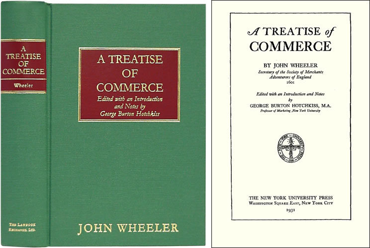 2004. ISBN-13: 9781584773955; ISBN-10: 1584773952. Wheeler, John. A Treatise of Commerce. Edited With an Introduction and Notes by George Burton Hotchkiss. Originally published: New York: The New York University Press, 1931. xi, 484 pp. Reprinted 2004 by The Lawbook Exchange, Ltd. ISBN-13: 9781584773955; ISBN-10: 1584773952. Hardcover. New. $49.95 * Published in 1601, this treatise is an unabashed work of propaganda on behalf of the Merchants Adventurers of England, an international trading company. Written by the company's secretary, John Wheeler [fl. 1601-1608], it is the earliest important example of corporate publicity. Moreover, it offers a detailed picture of business organizations and public-private partnerships during the Elizabethan era and glimpses of such personalities as Burghley, Cecil (the younger) and Queen Elizabeth. This book contains a facsimile of the rare first edition, as well as an unabridged critical edition by Hotchkiss, with detailed notes and an extensive introduction.