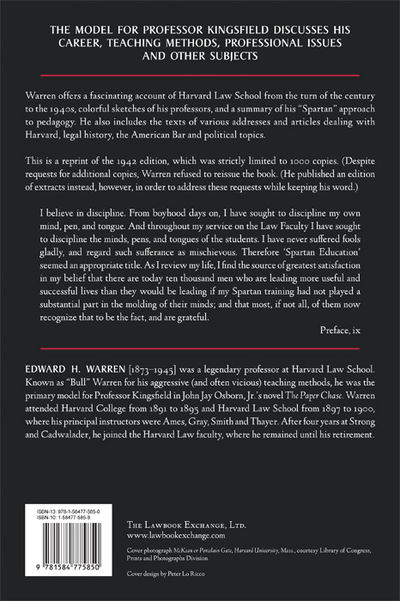 2013. ISBN-13: 9781584775850; ISBN-10: 1584775858. Warren, Edward H. Spartan Education. Originally published: Boston: Houghton Mifflin Company, 1942. xi, [i], 164 pp. Reprinted 2005, 2013 by The Lawbook Exchange, Ltd. ISBN-13: 9781584775850; ISBN-10: 1584775858. Hardcover. New. $39.95 * The Inspiration for Professor Kingsfield Discusses His Career, Teaching Methods Professional Issues and Other Subjects. Spartan Education offers a fascinating account of Harvard Law School from the turn of the century to the 1940s, colorful sketches of his professors, Mr. Cadwallader and a summary of his "Spartan" approach to pedagogy. Warren also includes the texts of various addresses and articles dealing with Harvard, legal history, the American Bar and political topics. This is a reprint of the 1942 edition, which was strictly limited to 1000 copies. (Despite requests for additional copies, Warren refused to reissue the book. (He published an edition of extracts instead, however, in order to address these requests while keeping his word.) "I believe in discipline. From boyhood days on, I have sought to discipline my own mind, pen, and tongue. And throughout my service on the Law Faculty I have sought to discipline the minds, pens, and tongues of the students. I have never suffered fools gladly, and regard such sufferance as mischievous. Therefore `Spartan Education' seemed an appropriate title. As I review my life, I find the source of greatest satisfaction in my belief that there are today ten thousand men who are leading more useful and successful lives than they would be leading if my Spartan training had not played a substantial part in the molding of their minds; and that most, if not all, of them now recognize that to be the fact, and are grateful." -- Preface, ix Edward H. Warren [1873-1945] was a legendary professor at Harvard Law School. Known as "Bull" Warren for his aggressive (and often vicious) teaching methods, he was the primary model for Professor Kingsfield in John Jay Osborn, Jr.'s novel The Paper Chase. Warren attended Harvard College from 1891 to 1895 and Harvard Law School from 1897 to 1900, where his principal instructors were Ames, Gray, Smith and Thayer. After four years at Strong and Cadwalader, he joined the Harvard Law faculty, where he remained until his retirement.