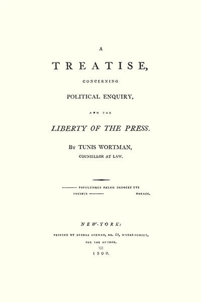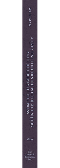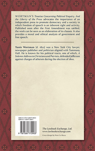 2003. ISBN-13: 9781584772903; ISBN-10: 1584772905. Wortman, Tunis. A Treatise Concerning Political Enquiry, and the Liberty of the Press. Originally published: New York: Printed by George Forman for the Author, 1800. xii, 296 pp. Reprinted 2003 by The Lawbook Exchange, Ltd. ISBN-13: 9781584772903. ISBN-10: 1584772905. Hardcover. New. $39.95 * Wortman's Treatise Concerning Political Enquiry, And the Liberty of the Press advocates the importance of an independent press to promote democracy and a society in which freedom of speech is an inherent right and activity. Published soon after the First Amendment was ratified, the work can be seen as an elaboration of its clauses. It also provides a moral and ethical analysis of government and free speech. Tunis Wortman [d. 1822] was a New York City lawyer, newspaper publisher and politician aligned with Tammany Hall. He is known for his political tracts, one of which, A Solemn Address to Christians and Patriots, defended Jefferson against charges of atheism during the election of 1800.