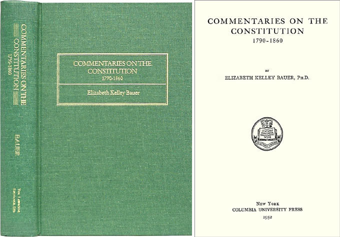 1999. ISBN-13: 9781886363663; ISBN-10: 1886363668. Bauer, Elizabeth Kelley. Commentaries on the Constitution 1790-1860. Originally published: New York: Columbia University Press, 1952. 400 pp. Reprinted 1999 by The Lawbook Exchange, Ltd. ISBN-13: 9781886363663; ISBN-10: 1886363668. Hardcover. New. $45. * A thorough survey and examination of the "formal commentaries" on the Constitution that were written as summaries of official pronouncements by proponents of the two major schools of constitutional interpretation before the Civil War--the nationalist Northern school, and the Southern states rights advocates who lacked an equal spokesman. As this important study places the commentaries in a historical context by comparing their theories, examining their impact and their roots in the lives of the authors, it serves to illustrate "the early divergence between the North and South in theoretical discussions of the nature of the Union, and eventually lead to the constitutional justification of Southern secession." From the Preface. Contains a useful Bibliography of Works Cited pages 361-380.