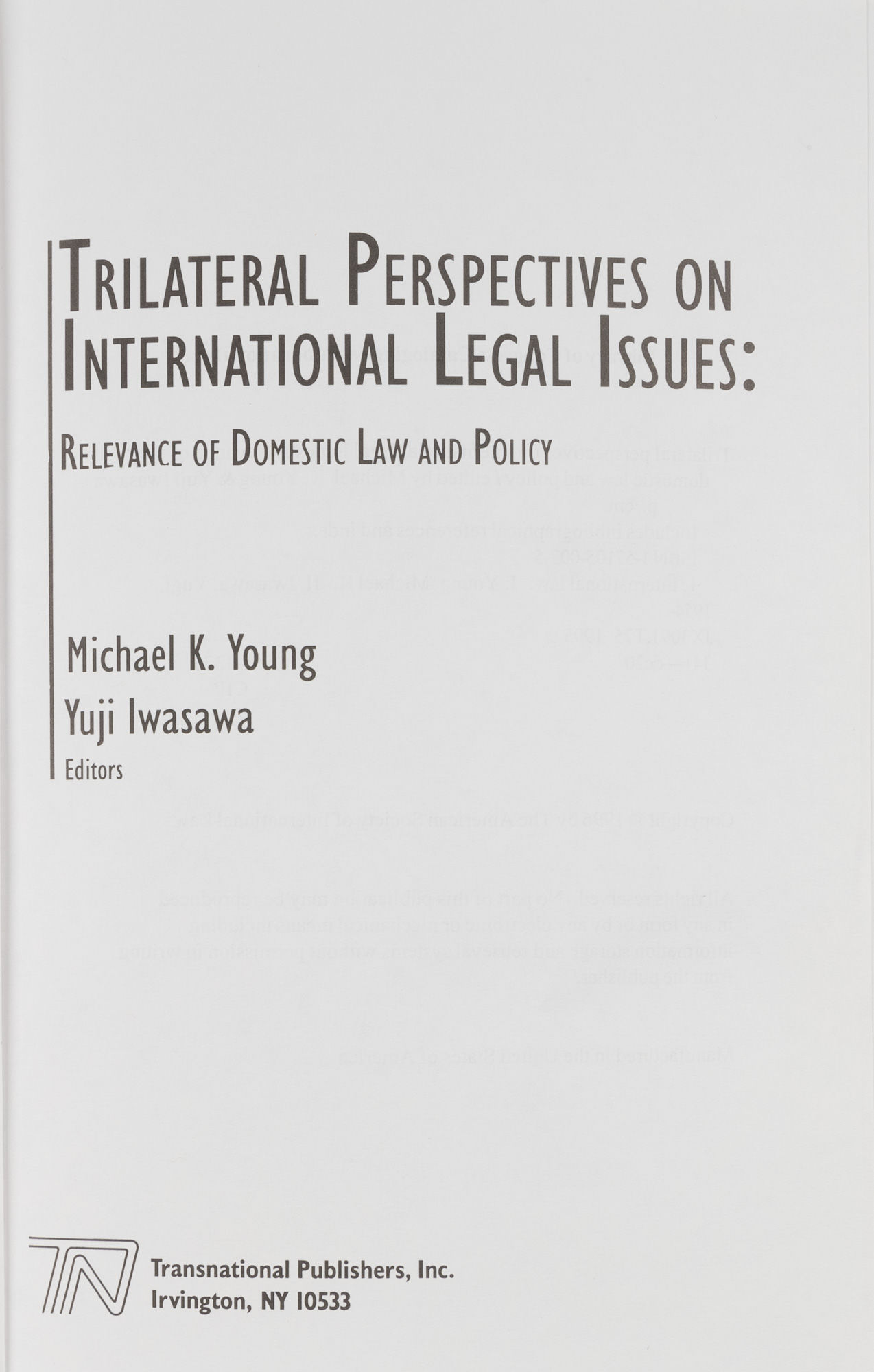1996. of Domestic Law and Policy. of Domestic Law and Policy. Young, Michael K., and Yuji Iwasawa, Editors. Trilateral Perspectives on International Legal Issues: Relevance of Domestic Law and Policy. Irvington: Transnational Publishers, Inc., 1996. xxxii, 604 pp. Cloth in dust jacket. New. $50. * Published under the auspices of the American Society of International Law, this essay collection by prominent legal scholars from the United States, Canada and Japan analyze critical areas of international law and offer important insights into groundbreaking developments concerning the law of the sea and environmental law, extraterritorial application of domestic law in trade and economic regulation, Japan-North American economic frictions, issues in the post-Cold War world and more.