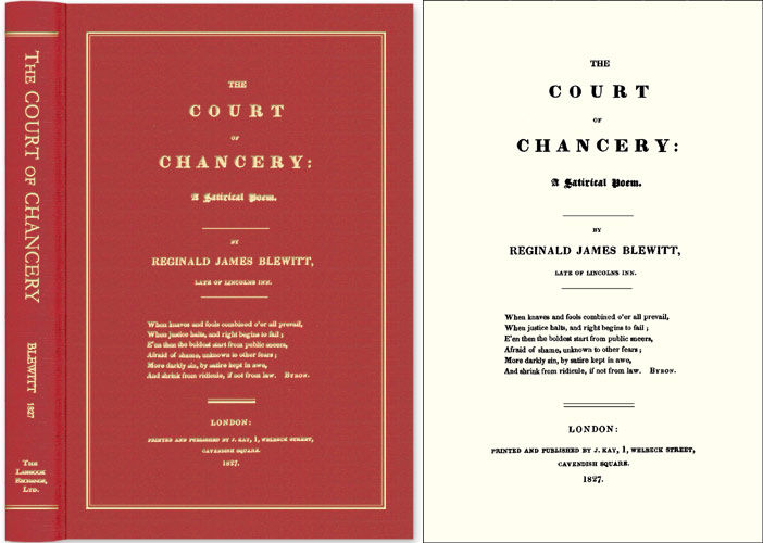 2006. ISBN-13: 9781584776482; ISBN-10: 158477648X. Legal Satire During the Age of Dickens and Trollope Blewitt, Reginald James. The Court of Chancery: A Satirical Poem. Originally published: London: J. Kay, 1827. 106 pp. Reprinted 2006 by The Lawbook Exchange, Ltd. ISBN-13: 9781584776482. ISBN-10: 158477648X. Attractively bound red cloth smyth sewn hardcover with gilt stamped spine and front cover. New. $24.95 * Reprint of the sole edition of a substantial legal satire by a lawyer. With its numerous thinly veiled references to prominent solicitors, chief clerks, magistrates and politicians, it is an engaging satiric portrait of the Chancery courts during the age of Dickens and Trollope. Its tone is set immediately in the first line: "Oh! Court of Equity, misnamed, where doubt / Leads many in; whence few, or none, get out." British Museum Catalogue (Compact Edition) 3:864.