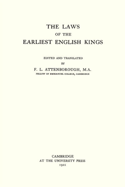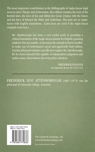 2017. ISBN-13: 9781584775836; ISBN-10: 1584775831. Attenborough, F.L., Editor and Translator. The Laws of the Earliest English Kings. Originally published: Cambridge: University Press, 1922. xii, 256 pp. Reprinted 2006, 2017 by The Lawbook Exchange, Ltd. ISBN-13: 9781584775836. ISBN-10: 1584775831. Hardcover. New. $30. * The most impressive contribution to the bibliography of Anglo-Saxon legal sources since Thorpe and Liebermann, this edition contains the texts of the Kentish laws, the laws of Ine and Alfred the Great, treaties with the Danes, and the laws of Edward the Elder and Aethelstan. The texts are in Anglo-Saxon with English translations. (Latin texts are used if the Anglo-Saxon originals were lost.) "Mr. Attenborough has done a very useful work in providing a critical translation of the Anglo-Saxon dooms for English-speaking students who are unable, or do not go far enough to find it needful, to make use of Liebermann's great and apparently final edition. Not that advanced scholars can afford to neglect Mr. Attenborough, for he shows himself fully capable of independent judgement and makes many observations deserving their attention": Frederick Pollock, Law Quarterly Review 38 (1922) 511. Frederick Levi Attenborough [1887-1973] was the principal of University College, Leicester.