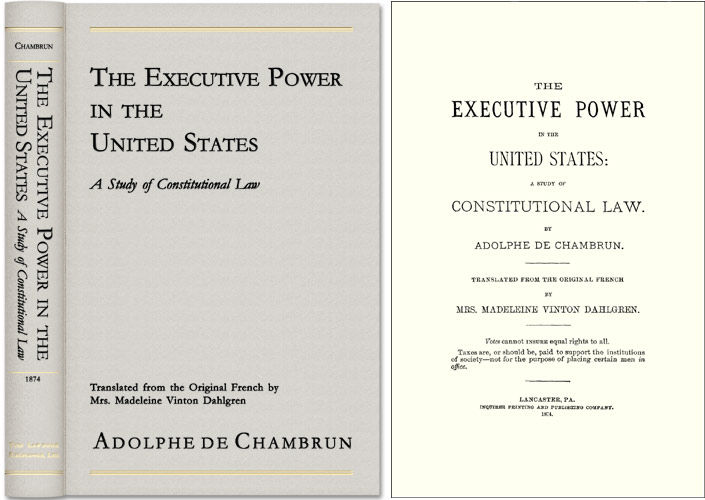 2004. ISBN-13: 9781584774020; ISBN-10: 1584774029. Chambrun, Adolphe de. The Executive Power in the United States: A Study of Constitutional Law. Translated From the Original French by Mrs. Madeleine Vinton Dahlgren. Originally published: Lancaster: Inquirer Printing and Publishing Company, 1874. xvii, 19-288, 15 pp. Reprinted 2004 by The Lawbook Exchange, Ltd. ISBN-13: 9781584774020; ISBN-10: 1584774029. Hardcover. New. $95. * With a preface by James A. Garfield. Like Tocqueville, the Marquis de Chambrun [1831-1891] was fascinated by the United States and its government. He also shared Tocqueville's belief that the United States is a testing ground for the forces shaping the modern world. Chambrun's study of the federal government's executive branch offers a number of interesting observations. He doubts the value of the vice-presidency and argues that quadrennial elections promote liberty by creating momentary periods of political instability. He offers equally interesting observations on such topics as the Civil War, the impeachment of President Johnson and the relationship between the Executive, Legislative and Judicial branches.
