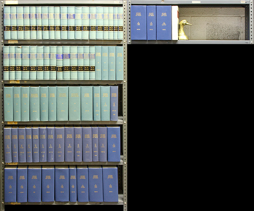 1992. 14 linear feet of shelf space. 14 linear feet of shelf space. Southern California Law Review. University of Southern California Gould School of Law. Volumes 1 to 66-1 (1927-1992). Vols. 1 to 65 hardcover (1927-1992); Vols. 66-1 original paper issues (Nov. 1992). Various blue bindings. Together 76 books, fourteen (14) linear feet of shelf space. Special $495. * The Southern California Law Review is the flagship scholarly journal of the USC Gould School of Law. The law review was established in 1927, and its students publish six issues in each annual volume. Each issue normally contains several articles written by outside contributors and several notes written by students from the University of Southern California Gould School of Law. The Law Review strives to publish articles on a wide range of topics and to serve all segments of the legal community. In addition, the Law Review frequently hosts a forum in order to explore timely or controversial areas of law.