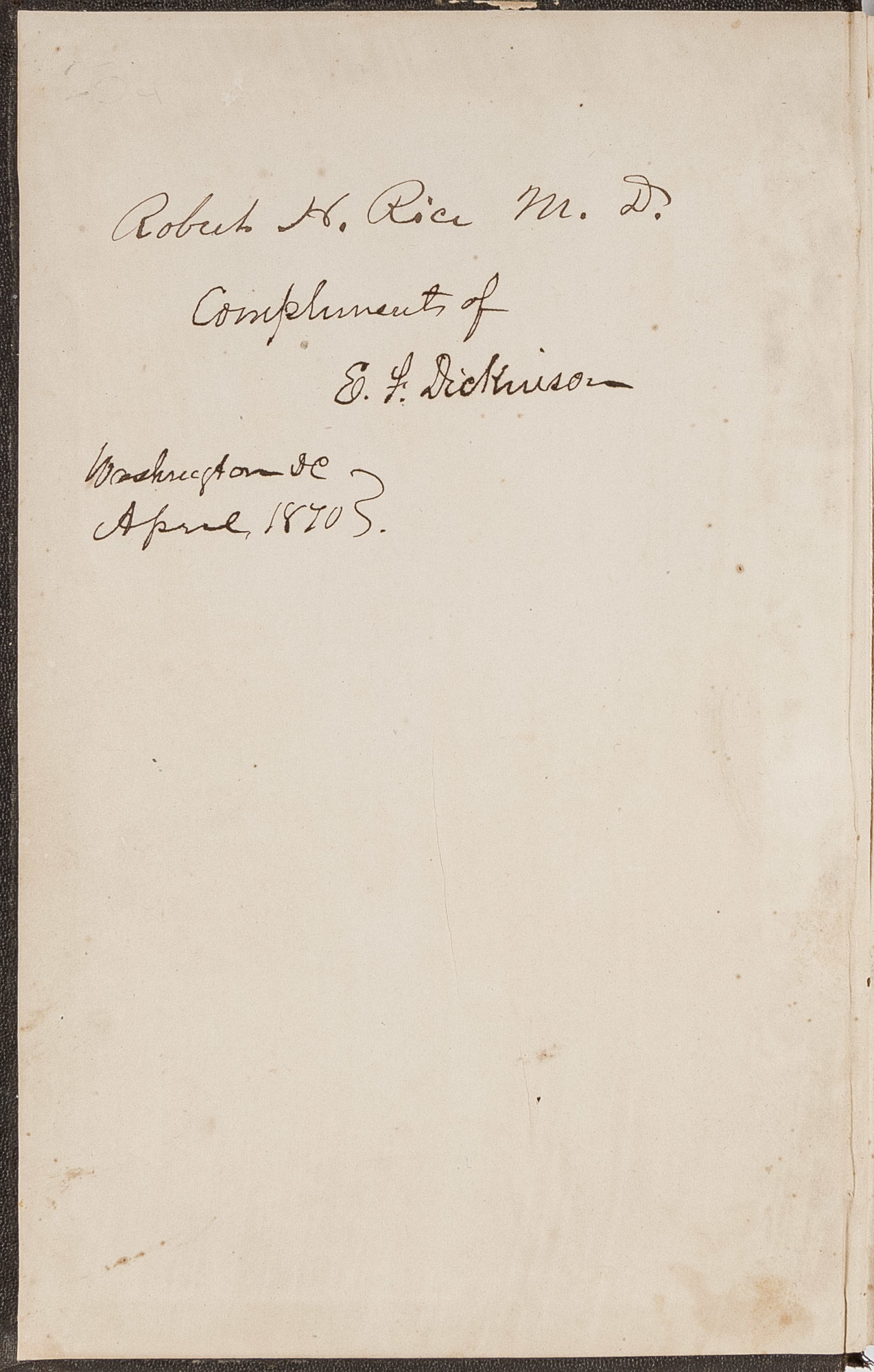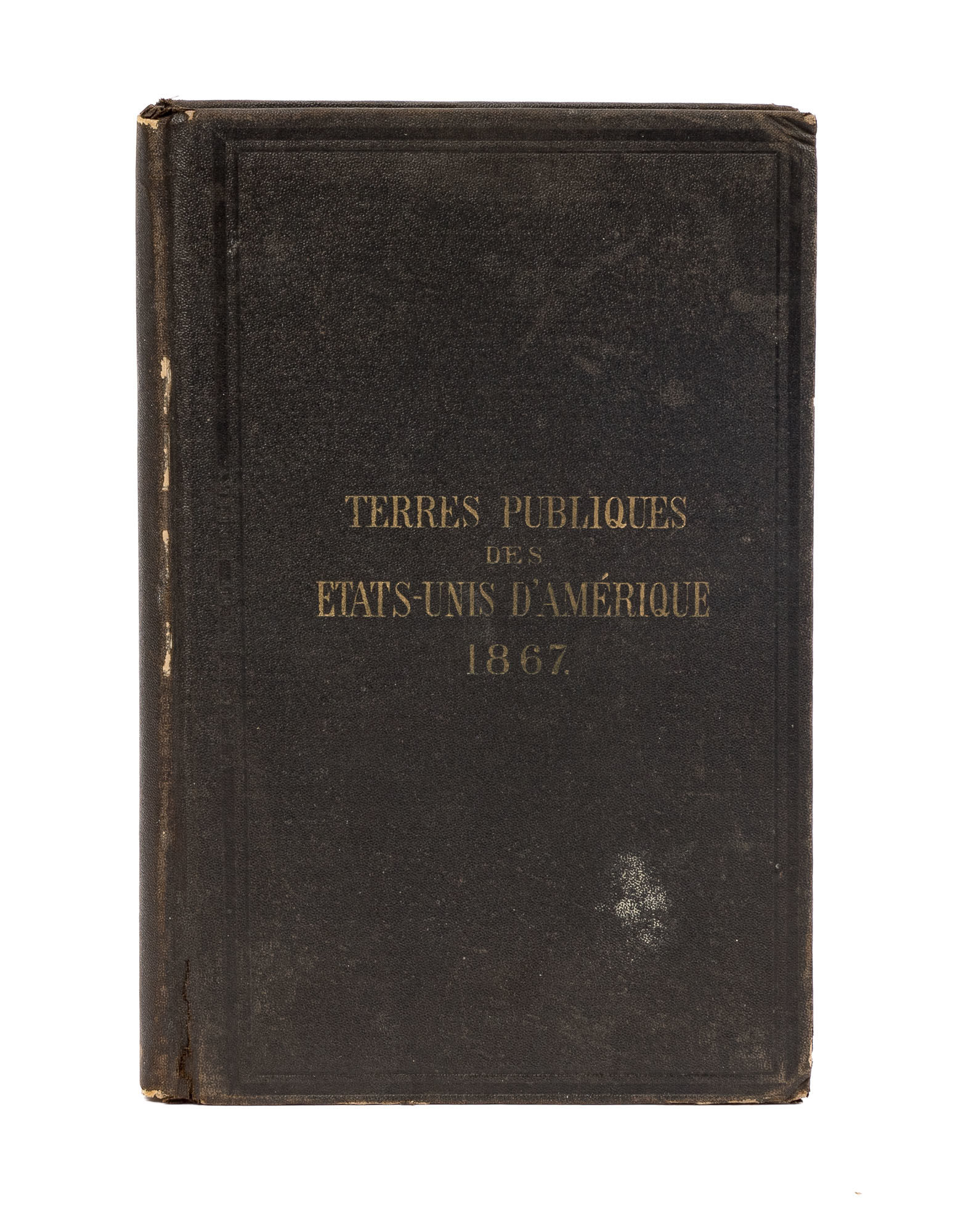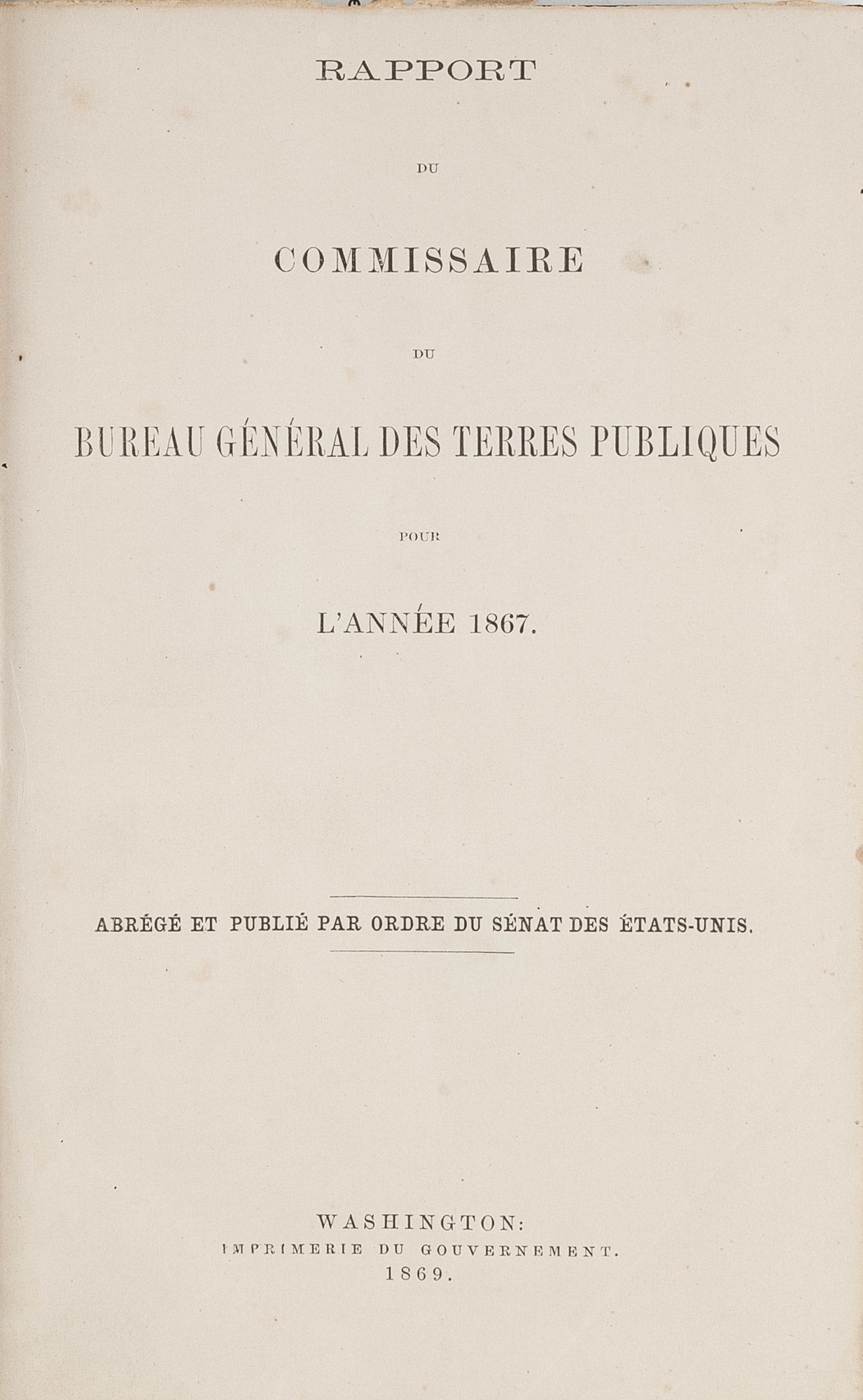 1869. [American Land Report of 1867]. Rapport du Commissaire du Bureau General des Terres Publiques pour L'Annee 1867. Abrege et publie par ordre du Senat des Etats-Unis. Washington: Imprimerie du Gouvernment, 1869. [1], 201 pp. Complete. Nineteenth-century publisher's cloth, gilt stamped front cover. Presentation inscription "Robert H. Rice M.D./ Compliments of/ E.F. Dickinson/ Washington D.C./ April 1870" to front pastedown. Hinges cracked but secure. Internally clean. $100. * This copy was likely presented by Edward Fenwick Dickinson [1829-1891] to Robert Harvey Rice [1837-1906]. Both men were born in Fremont, Ohio. Dickinson was an attorney and probate judge who served in Congress from 1869-1871.
