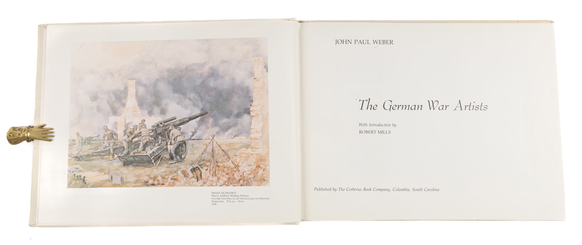1979. Weber, John Paul. The German War Artists. With Introduction by Robert Mills. Columbia, South Carolina: The Cerberus Book Company, [1979]. Frontispiece. Illustrations. 151 pp. Cloth, ex-library bookplate, stamped front free endpaper. Gilt stamped binding lightly rubbed and soiled. Good. $25. * First edition. Limited edition of 500. This copy unnumbered.
