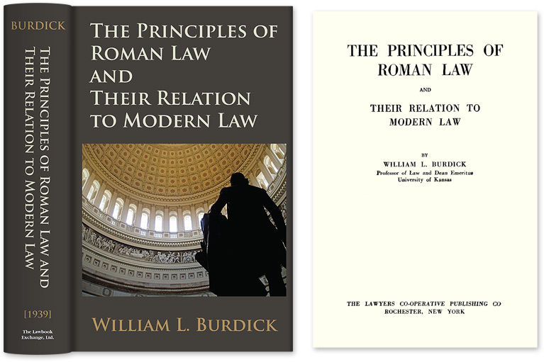 2012. ISBN-13: 9781584772538; ISBN-10: 1584772530. Burdick, William L. The Principles of Roman Law and Their Relation to Modern Law. Originally published: Rochester: The Lawyers Co-operative Publishing Co., [1938]. xxi, 748 pp. Reprinted 2004, 2012 by The Lawbook Exchange, Ltd. ISBN-13: 9781584772538; ISBN-10: 1584772530. Hardcover. New. $64.95 * This book offers a fine introduction to Roman law and its significance to personal and family law in the English, American and civil-law systems. Contents include "The World Wide Extension of Roman Law," "The Civil Law in the United States and Canada," "Outlines of Roman Law History," "The Corpus Juris Civilis," "The Law of Persons including Marriage, Husband and Wife, Divorce, Parent and Child, Guardian and Ward," "The Law of Property," "The Law of Obligations," "The Law of Succession," "The Law of Actions" and "The Law of Public Wrongs." A solid introduction to the subject of Roman law and its application in personal and family law in subsequent legal systems. "The book covers the full range of substantive Roman law, as well as the extension of Roman law throughout the modern world and, in particular, the influence of Roman law in the United States and England. Unlike most American legal scholars, Burdick was sufficiently familiar with the primary sources of Roman law, from Cicero to Justinian, to write from them rather than secondary literature and translations. At the same time, he was exceptionally well-versed in English and American case law and able to use these sources to show developments and parallels. It was a scholarly tour-de-force." -- Michael H. Hoeflich, University of Kansas Law Review 49 (2000-2001) 1146-1147. William L. Burdick [1860-1946] was a professor of law (1898-1912) and a highly-regarded and popular dean at the University of Kansas School of Law. The William L. Burdick Prize is given annually in his honor. From 1919-1924, at the charge of Congressman E.C. Little of Kansas, he recodified existing U.S. statutes. He was the author of The Elements of the Law of Sale and Property (1901), Handbook of the Law of Real Property (1914), The Bench and Bar of Other Lands (1939) and other works.