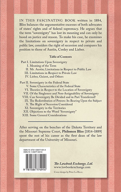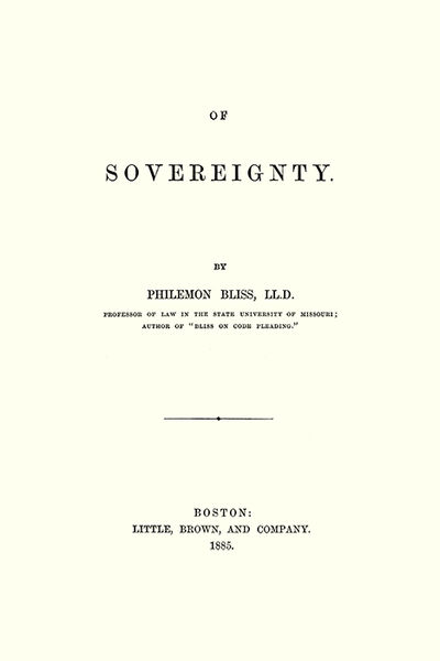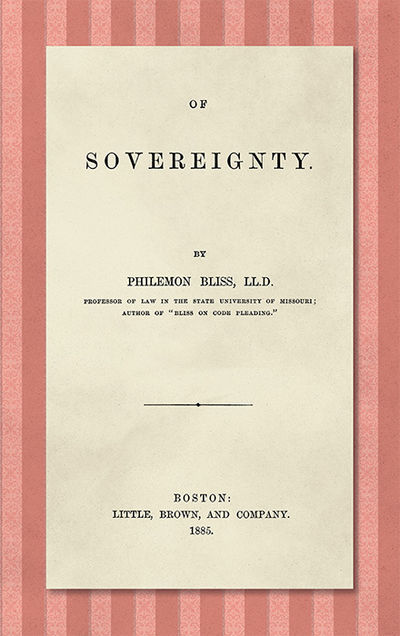2005. ISBN-13: 9781584774914; ISBN-10: 1584774916. Bliss, Philemon. Of Sovereignty. Originally published: Boston: Little, Brown, and Company, 1885. xv, 180 pp. Reprinted 2005, 2019 by The Lawbook Exchange, Ltd. ISBN-13: 9781584774914; ISBN-10: 1584774916. Hardcover. New. $34.95 * Of Sovereignty argues that the term "sovereignty" has lost its meaning and can only be based on justice and reason. In this fascinating book written in 1884, Bliss balances the argumentative excesses of both advocates of states' rights and of federal supremacy. To make his case, he examines the limitations on sovereignty in respect to private and public law, considers the right of secession and discusses the positions of Austin, Cooley and Lieber at length. After serving on the benches of the Dakota Territory and the Missouri Supreme Court, Bliss [1814-1889] finished his career as the first dean of the law department of the University of Missouri.