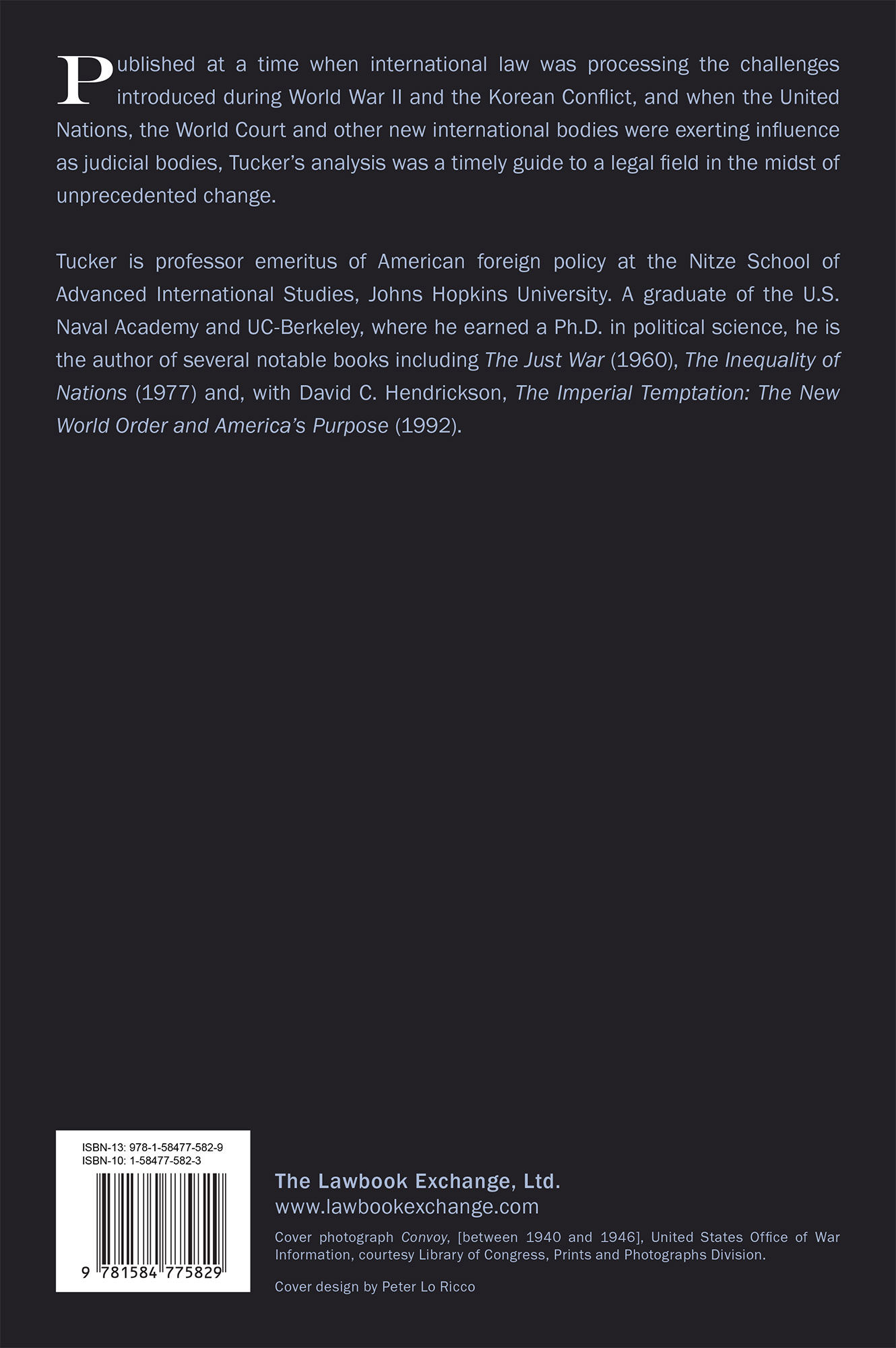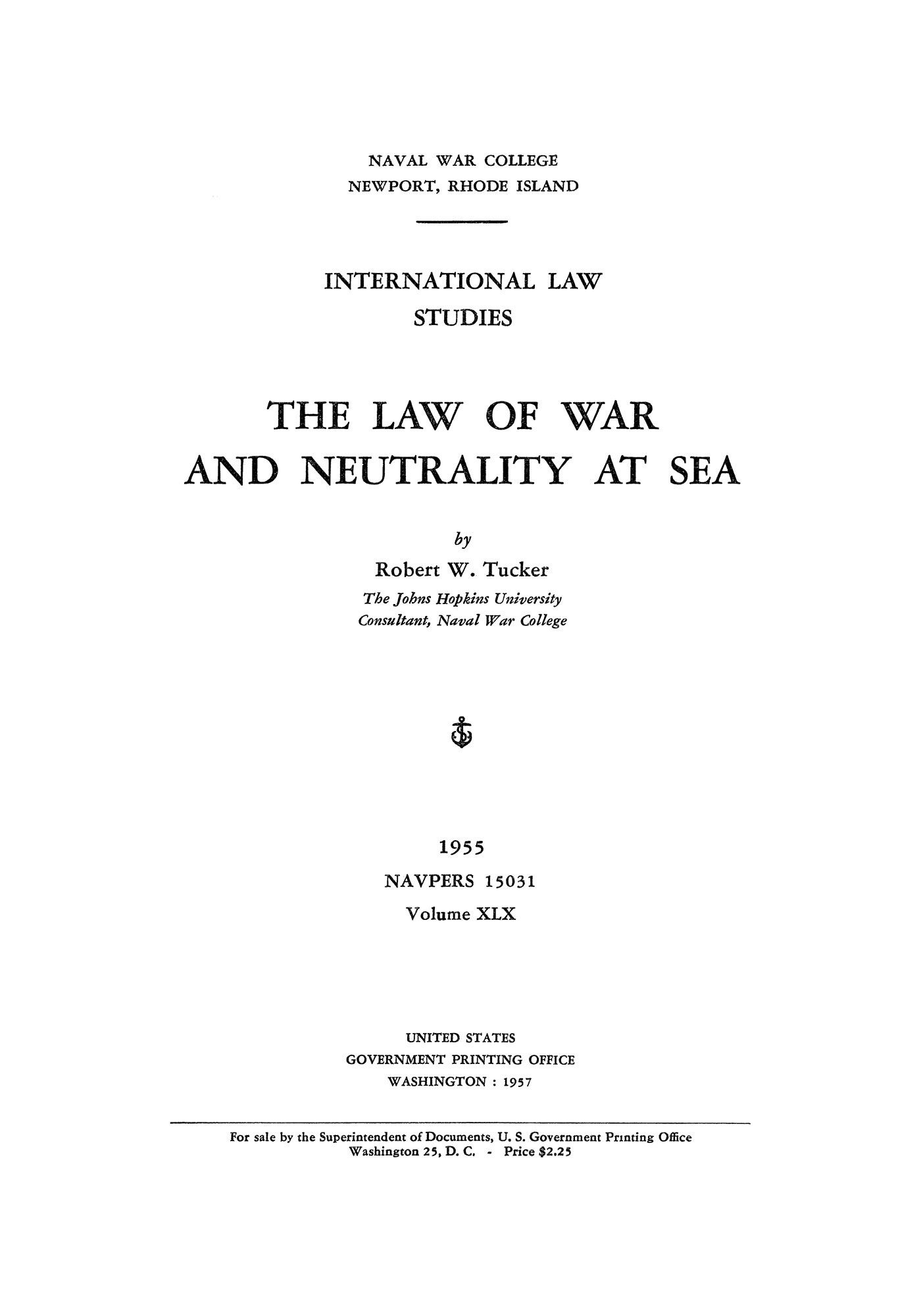 2006. ISBN-13: 9781584775829; ISBN-10: 1584775823. Tucker, Robert W. The Law of War and Neutrality at Sea. Originally published: Washington: United States Government Printing Office, 1955. xiii, 448 pp. Reprinted 2006 by The Lawbook Exchange, Ltd. ISBN-13: 9781584775829. ISBN-10: 1584775823. Hardcover. New. $49.95 * Published at a time when international law was processing the challenges introduced during World War II and the Korean Conflict, and when the United Nations, the World Court and other new international bodies were exerting influence as judicial bodies, Tucker's analysis was a timely guide to a legal field in the midst of unprecedented change. Tucker is professor emeritus of American foreign policy at the Nitze School of Advanced International Studies, Johns Hopkins University. A graduate of the U.S. Naval Academy and UC-Berkeley, where he earned a Ph.D. in political science, he is the author of several notable books including The Just War (1960), The Inequality of Nations (1977) and, with David C. Hendrickson, The Imperial Temptation: The New World Order and America's Purpose (Council on Foreign Relations, 1992).