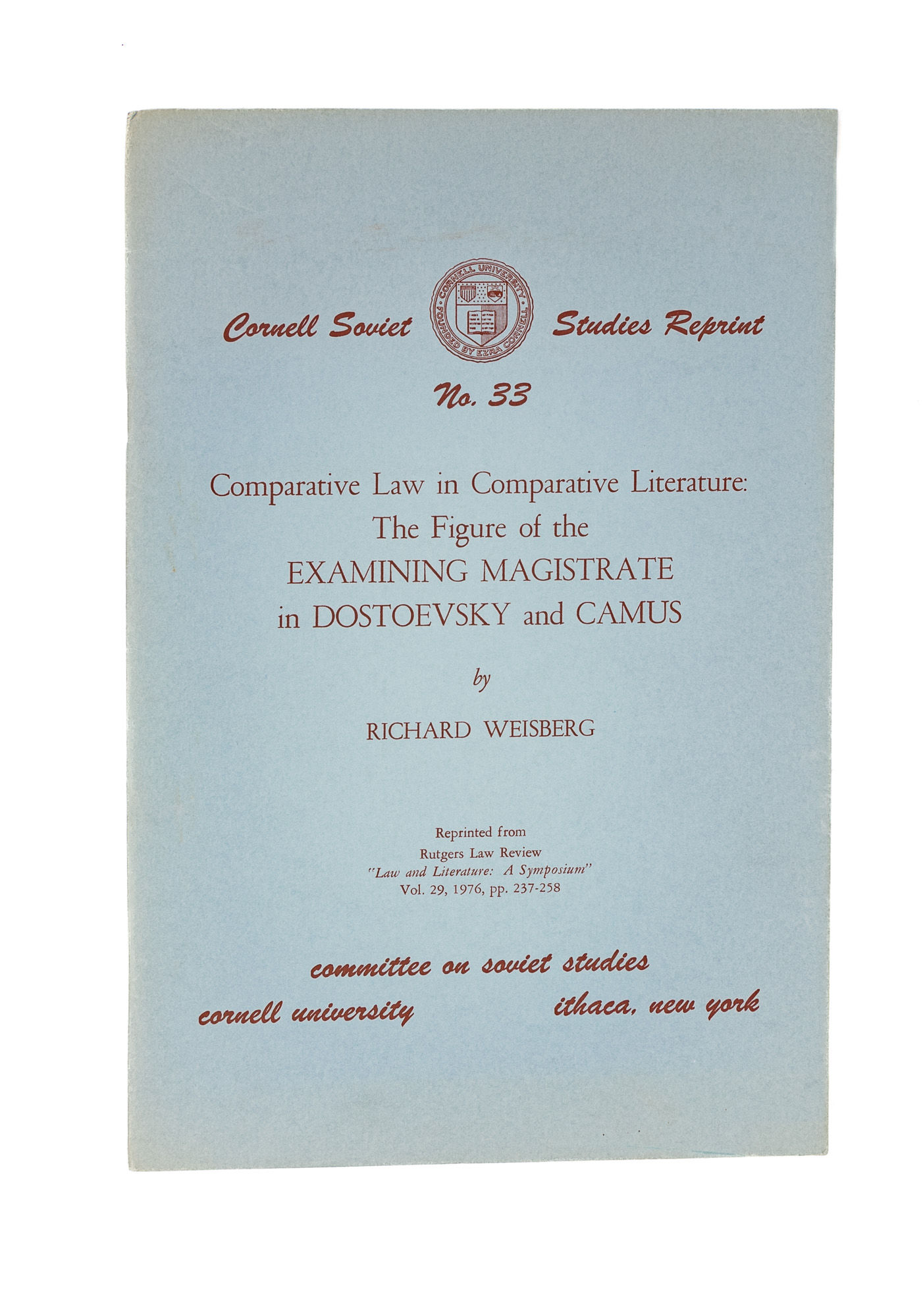 1976. Weisberg, Richard. Comparative Law in Comparative Literature: The Figure of the "Examining Magistrate" in Dostoevski and Camus. Rutgers University, 1976. 237-258 pp. Printed wrapper lightly rubbed and faded. Good. $35. * Reprinted from Rutgers Law Review Vol. 29, Winter 1976, Number 2.