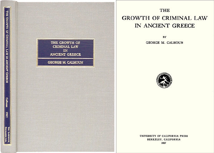 2000. ISBN-13: 9781584770374; ISBN-10: 1584770376. Calhoun, George M. The Growth of Criminal Law in Ancient Greece. Originally published: Berkeley: University of California Press, 1927. x, 149 pp. Reprinted 2000 by The Lawbook Exchange, Ltd. ISBN-13: 9781584770374; ISBN-10: 1584770376. Hardcover. New. $34.95 * A fascinating examination of the evolution of criminal law in ancient Greece that begins with the Homeric era and highlights Solon's impact on legislation and the institution of criminal action.