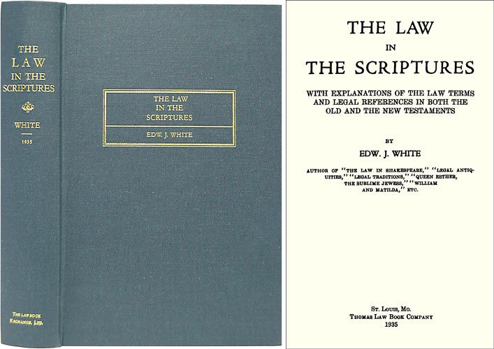 2000. ISBN-13: 9781584770763; ISBN-10: 1584770767. White, Edw. J. The Law in the Scriptures: With Explanations of the Law Terms and Legal References in Both the Old and the New Testaments. Originally published: St. Louis: Thomas Law Book Company, 1935. xxiv, 422 pp. Reprinted 2000 by The Lawbook Exchange, Ltd. ISBN-13: 9781584770763; ISBN-10: 1584770767. Smythe sewn, blue cloth hardcover with gilt stamped spine and front cover. New. $39.95 * Takes the books of the Bible in order, each chapter corresponding to a Book. "No lawyer can read this book without having impressed upon him more firmly than ever before the conviction that in a world of changes and turmoil, the fundamental principles of justice have remained unaltered down through the ages...The great mass of scholarly and useful information that has been collected in this work is a credit to its author. Any lawyer will find the book of great assistance in tracing the origin of our law.": Kansas City Law Review 3:94 cited in Marke, A Catalogue of the Law Collection of New York University (1953) 110.