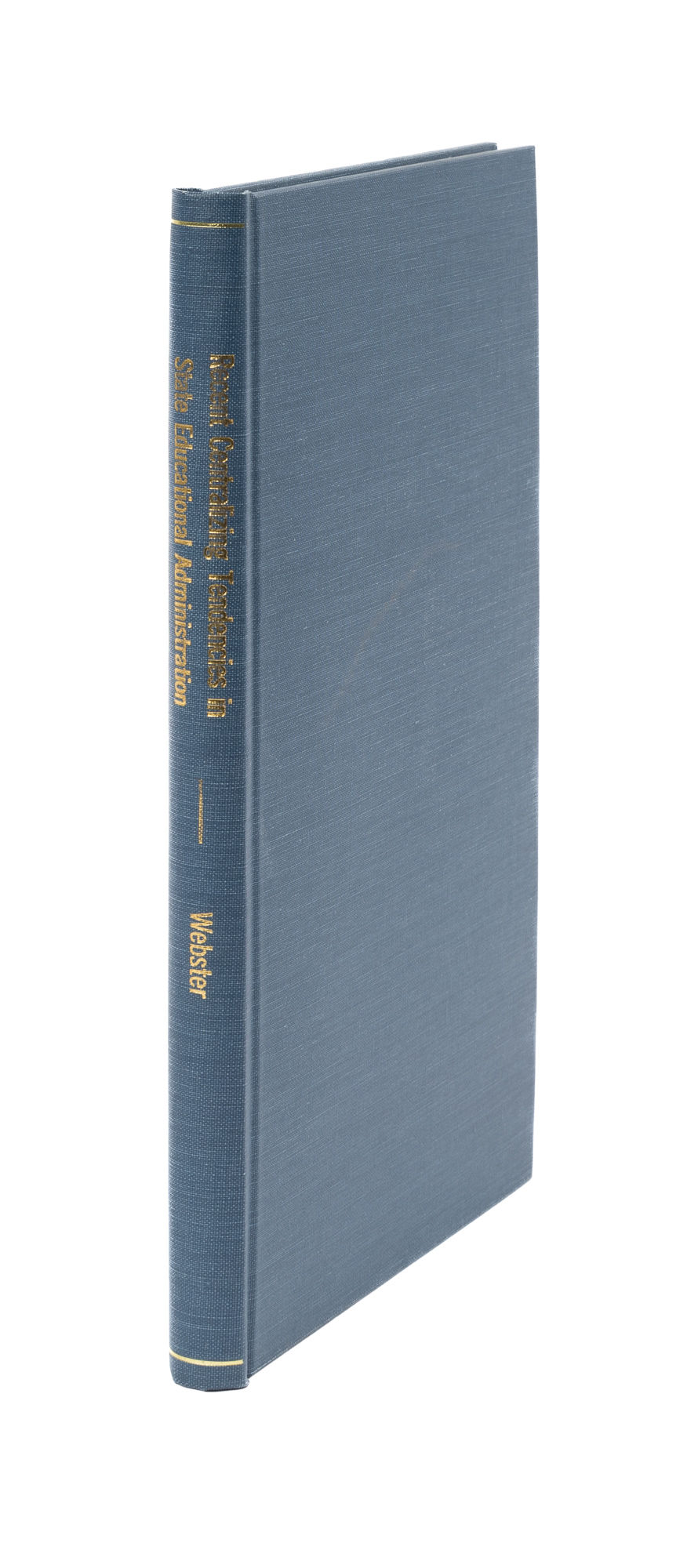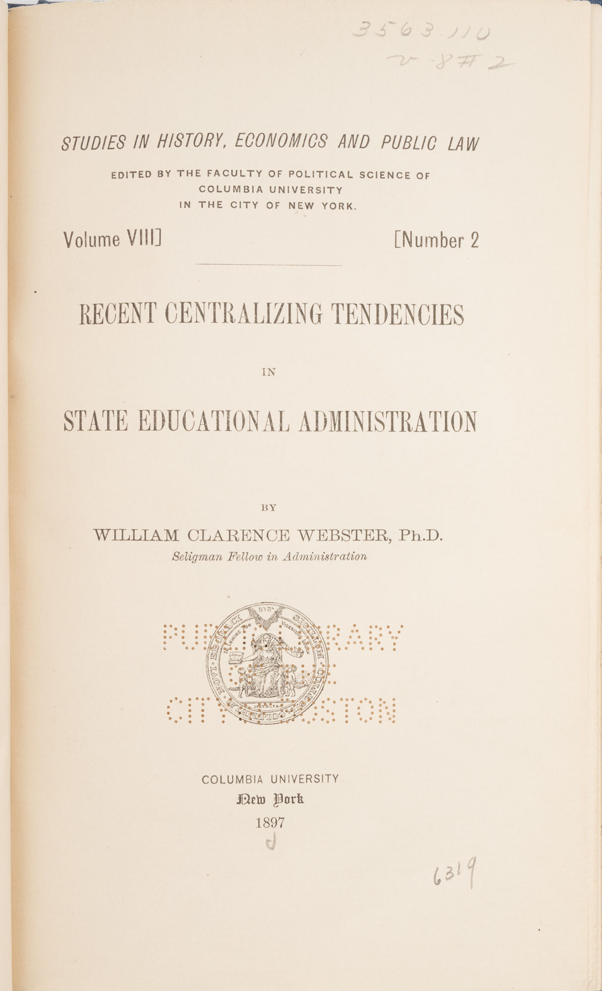 1897. Webster, William Clarence. Recent Centralizing Tendencies in State Educational Administration. New York: Columbia University Press, 1897. 78, [6] pp. Includes six pages of advertisements. Newly rebound in blue cloth with gilt-stamped spine. Ex-library. Perforated stamp to title page. $30. * A title in the series Studies in History, Economics and Public Law edited by the Political Science Faculty of Columbia University.