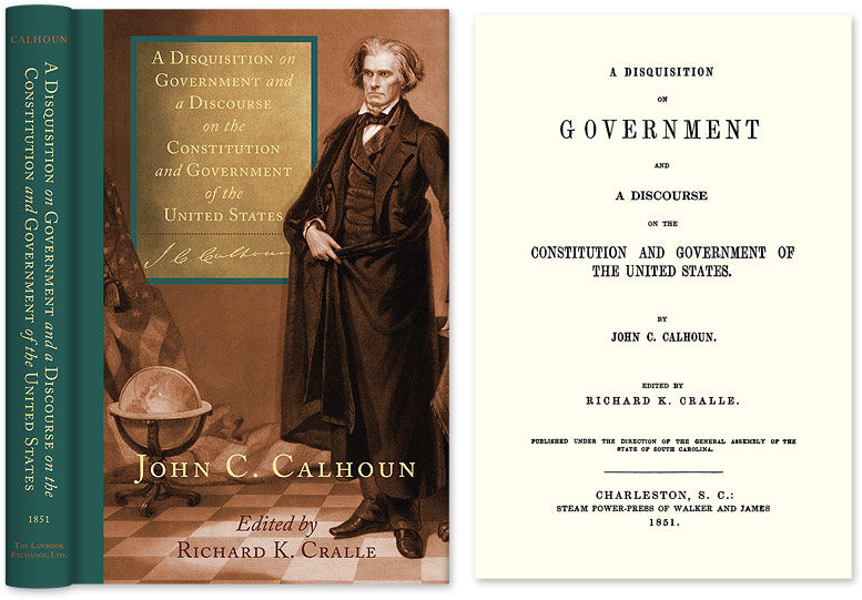2012. ISBN-13: 9781584771272; ISBN-10: 1584771275. Calhoun, John C. A Disquisition on Government and a Discourse on the Constitution and Government of the United States. Edited by Richard K. Cralle. Originally published: Charleston, S.C.: Steam Power-Press of Walker and James, 1851. viii, 406 pp. Reprinted 2002, 2012 by The Lawbook Exchange, Ltd. ISBN-13: 9781584771272; ISBN-10: 1584771275. Hardcover. New. $39.95 * AN INFLUENTIAL THEORY OF MINORITY RIGHTS "In Calhoun's last years he drafted two essays that set forth his ideas on political theory. The first and shorter essay, `The Disquisition on Government,' is the more significant in that Calhoun sought to develop a consistent theory of minority rights within the context of majority rule. He urged universal recognition of the inequality of mankind and the differentiation of social and economic concerns. For an organized society to work in a harmonious and practical sense, these differences, Calhoun contended, had to be recognized and then institutionalized. He was, of course, arguing for his section and its `peculiar institution,' but nowhere does he mention slavery in the essay. Calhoun's thought as developed in the "Disquisition," and to a lesser extent in his `Discourse on the Constitution,' remains an original contribution to the history of political theory. His assertion of pluralism in political representation has influenced diverse critics of society, including liberal supporters of civil rights and conservative defenders of special social and economic interests." --JOHN NIVEN, "JOHN C. CALHOUN," American National Biography 4:215-216 Secretary of war and state, a two-time vice president and one of the more notable senators in U.S. history, JOHN C. CALHOUN [1782-1850] was one of the greatest American statesmen of the nineteenth century. An important political theorist and inspiration to the secessionists, he advanced sophisticated and impassioned arguments in favor of slavery, limited government and states' rights. See Cohen, Bibliography of Early American Law II: 358 (5748).