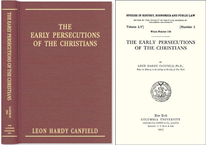 2005. ISBN-13: 9781584774815; ISBN-10: 1584774819. Canfield, Leon Hardy. The Early Persecutions of the Christians. Originally published: New York: Columbia University Press, 1913. 215 pp. Reprinted 2005 by The Lawbook Exchange, Ltd. ISBN-13: 9781584774815. ISBN-10: 1584774819. Hardcover. New. $26.95 * Based on a sensitive reading of all known primary sources, many of a legal or legislative nature, Canfield reconstructs the early history of the Christians' persecution. After discussing their legal basis, he shows how the law was employed from the reign of Nero through the reign of Hadrian. The book has two parts. Each chapter in Part I has a corresponding chapter of relevant source documents in Part II. All appear in translation, some are also presented in the original Latin or Greek. Originally published as Volume LV, Number 2 in Columbia's series Studies in History, Economics and Public Law.