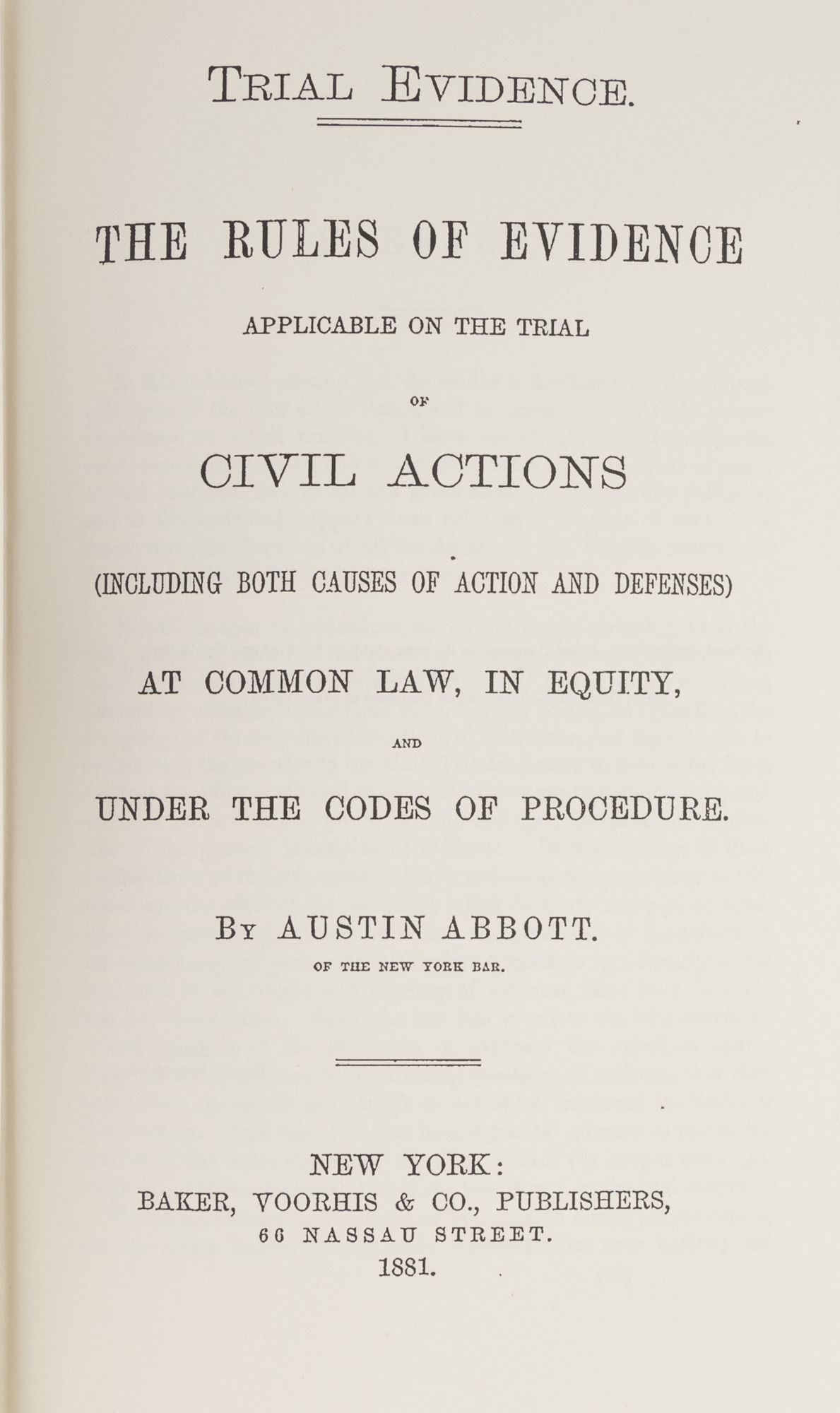 2000. Abbott, Austin. Trial Evidence. The Rules of Evidence Applicable in the Trial of Civil Actions (including both Causes of Action and Defenses) at Common Law, in Equity, and Under the Codes of Procedure. New York: Baker, Voorhis & Co., Publishers, 1881. xxx, 884 pp. Reprint Buffalo: William S. Hein & Co., Inc, 2000. Cloth. New. $95.