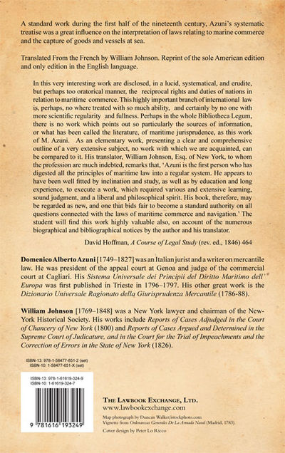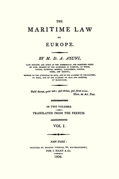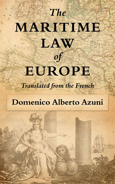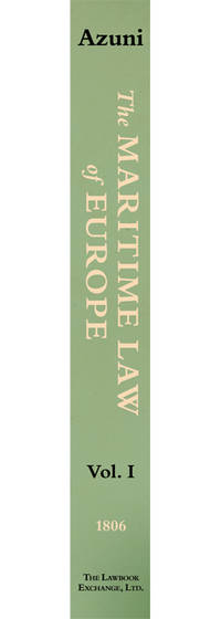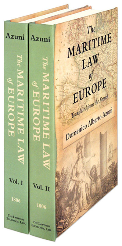 2014. ISBN-13: 9781584776512; ISBN-10: 158477651X. Azuni, D[omenico] A[lberto] [1749-1827]. The Maritime Law of Europe. Translated from the French [by William Johnson]. Originally published: New York: Printed by George Forman for I. Riley & Co., 1806. 2 Volumes. xxxii, 424; viii, 430, [1] pp. Reprinted 2006, 2014 by The Lawbook Exchange, Ltd. ISBN-13: 9781584776512. ISBN-10: 158477651X. Hardcover. New. $95. * Reprint of the sole American edition and only edition in the English language. This systematic work on the maritime law of Europe, of great influence on the prize laws relating to the legality of the capture of goods and vessels at sea, as well as for the analysis of Rhodian laws and the Consolato del Mare. D.A. Azuni was an Italian jurist and a writer on mercantile law who later became a French citizen and then president of the appeal court at Genoa and judge of the Commercial Court at Cagliari. First published in Italian in 1795-6 (Sistema universale dei principii del diritto marittimo dell'Europa) Azuni's treatise "relates rather to maritime international law, properly so called, than to private maritime jurisprudence... It points out what is always of the highest importance to the diligent inquirer after truth, the sources of information upon maritime jurisprudence... The English translation from the French, by William Johnson is excellent, and his notes show a familiarity and accurate acquaintance with legal and classical antiquities.": Marvin, Legal Bibliography (1847) 82.
