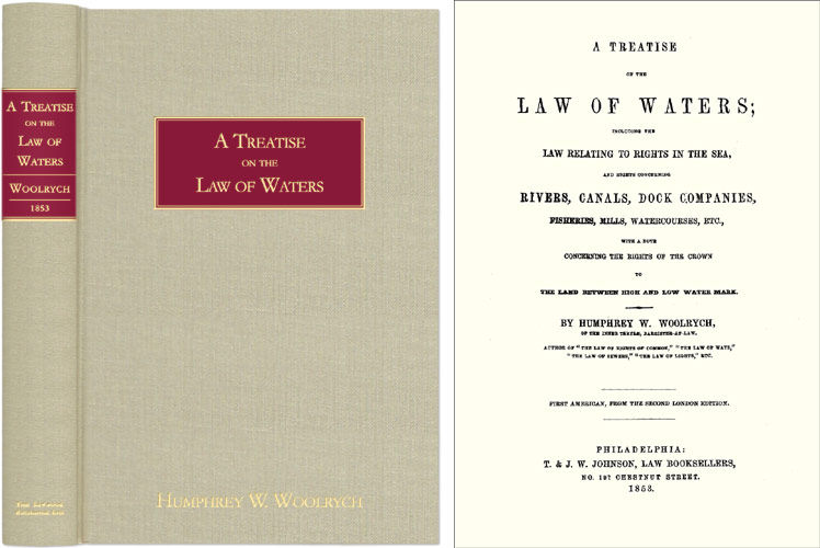 2005. ISBN-13: 9781584775218; ISBN-10: 1584775211. Woolrych, Humphrey W. A Treatise of the Law of Waters; Including the Law Relating to Rights in the Sea, and Rights Concerning Rivers, Canals, Dock Companies, Fisheries, Mills, Watercourses, Etc., with a Note Concerning the Rights of the Crown to the Land Between High and Low Water Mark. Philadelphia: T. & J.W. Johnson, 1853. xxvii, 432 pp. Reprinted 2005 by The Lawbook Exchange, Ltd. ISBN-13: 9781584775218. ISBN-10: 1584775211. Attractive Smythe sewn tan cloth hardcover with red gilt lettered cover and spine. New. $95. * Reprint of the first American edition, from the second London edition, 1851, to which it is starred. First published in 1830, A Treatise of the Law of Waters is a comprehensive work notable for its clear explanation of several complex areas, such as the law of fisheries. It begins with a summary of various water rights, then proceeds to consider non-commercial rights in the seas and rivers, canals, docks, waterworks, fisheries and water mills. The final chapter addresses watercourses, which he defines as private rights of water. In all, Woolrych offers a superb overview of Anglo-American water law as it stood in the mid-nineteenth century. A prolific and learned scholar, Woolrych [1795-1871] wrote several treatises and biographies including Lives of Eminent Serjeants-at-Law, which is available as a Lawbook Exchange reprint.