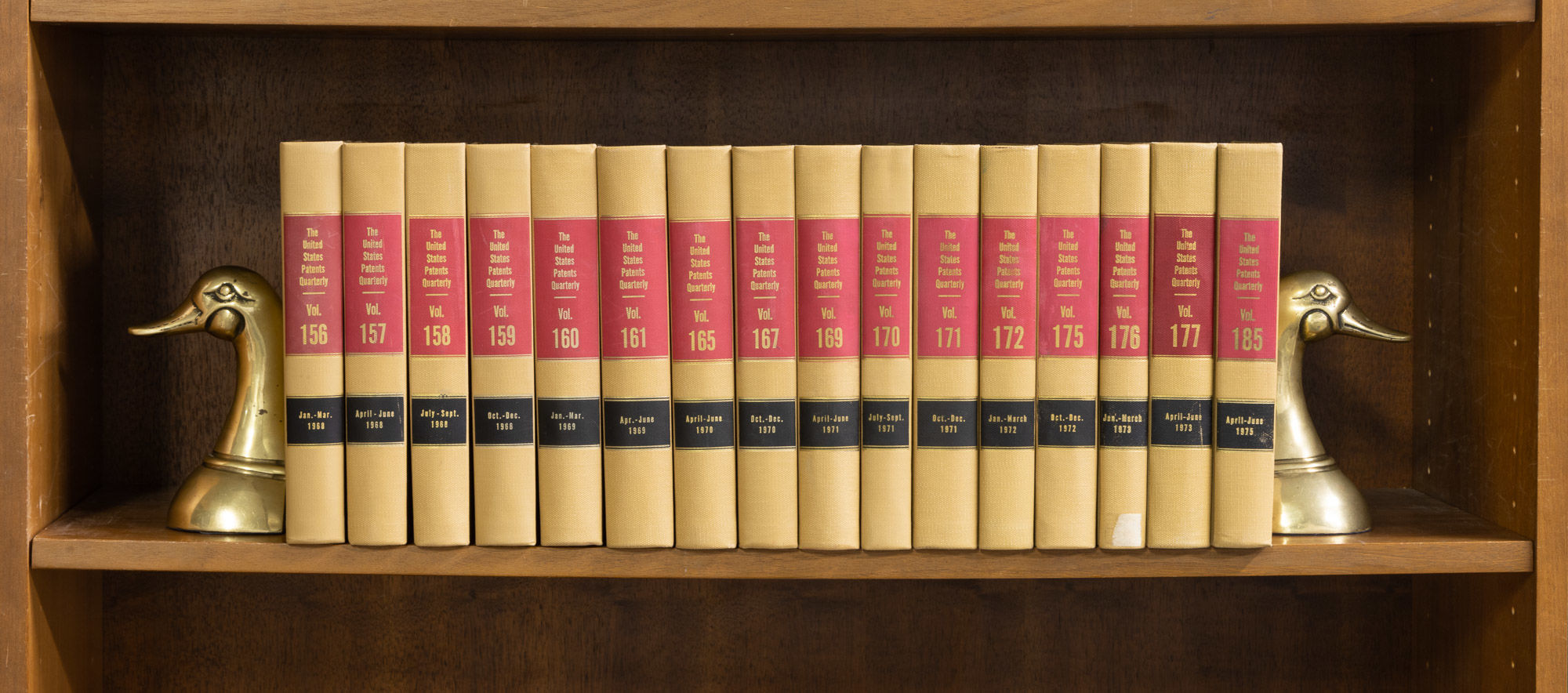 1981. Two (2) linear feet.. Two (2) linear feet. United States Patents Quarterly [1st]. Washington: Bureau of National Affairs, 1946-1981. 16 volumes: 156, 157, 158, 159, 160, 161, 165, 167, 169, 170, 171, 172, 175, 176, 177, 185. Together 16 books. Ex-private law firm library with stamps, else very good. Two (2) linear feet shelf space. $250.