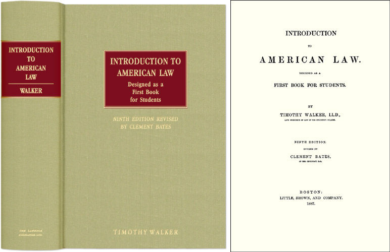 2002. ISBN-13: 9781584772149; ISBN 158477214X. Walker, Timothy. Introduction to American Law. Designed as a First Book for Students. Ninth Edition. Revised by Clement Bates. Originally published: Boston: Little, Brown, and Company, 1887. xxvi, 841 pp. Reprinted 2002 by The Lawbook Exchange, Ltd. ISBN-13: 9781584772149; ISBN 158477214X. Attractive smyth sewn cloth bound hardcover. New. $39.95 * A systematic outline of American law, written to fill a void in this area which "...for many years was used as a textbook for American law students." Marke, A Catalogue of the Law Collection at New York University (1953) 250. Based on lectures given by Walker [1802-1856] while a law professor at Cincinnati College.