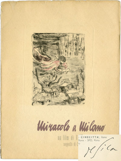 Rome: Albert and Charles Boni, 1951. Original Italian program for the 1951 film, based on the novel "Toto il buono" by Cesare Zavattini. SIGNED by Vittorio De Sica at the bottom of the title page. One of the director's classics, pure visual storytelling, made just after "Bicycle Thieves" (1948) and just before "Umberto D." (1952). A gorgeous, oversize program with a central illustration on the front wrapper within a debossed frame. The wrapper houses 6 loose deluxe card plates, as issued, the first two devoted to text, and the last four being full-color lithograph illustrations reflecting the film story. One of the most beautiful programs we've ever seen. Plates Near Fine, outer wrapper Very Good plus with a few tears at the edges but no loss, 12.75 x 17.25 inches.