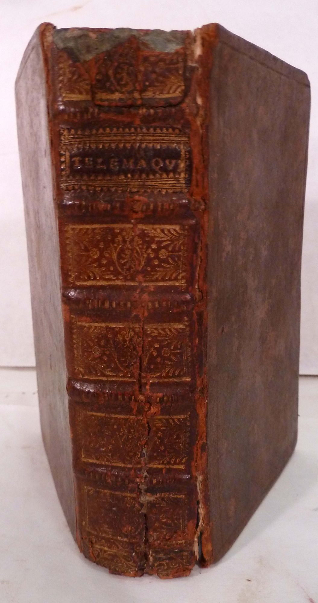 Paris: Jacques Estienne, 1717. leather_bound. Contemporary full mottled calf. Very good. 526 pages. 16 x 9.5 cm. Twenty-six engraved plates mostly after Giffart, large folding map, engraved head piece. A biting attack on absolute monarchy, and one of the most popular works of the century. BRUNET Vol. II, pp. 1212-1213 gives this edition praise: "De Toutes les anciennes editions du Telemaque imprimees a Paris, celle-ci est la plus belle et celle qui merite le plus de conserver une place dans la bibilotheque d'un curioux." Text generally clean, frontispiece slightly shaved at margin, raised bands, spine panels richly gilt, half centimeter loss at spine head, small creases lower backstrip, marbled endpapers.