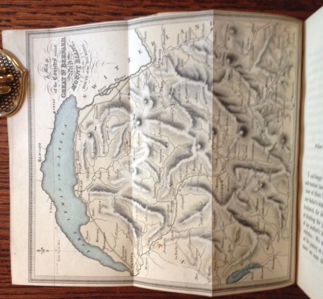 London: Harvey and Darton, 1827. 1st. Full-Leather. Collectible; Fine. A lovely copy of the 1827 1st edition, bound (from the early 20th century) in a sumptuous full calf, with gilt-rule at the panels and lavishly gilt-decorated compartments divided by 5 raised bands. 16 beautiful hand-colored vignettes and an immaculate fold-out map of "the Country round Great St. Bernard and Mt. Blanc". 12mo, 144 pgs., all edges gilt. Attractive marbled endpapers and new laid-in endsheets. "With Descriptions Copied from a Journal Kept by the Author; and Drawings Taken from Nature. Intended for Young Persons from Ten to Fourteen Years of Age" (from the title page).