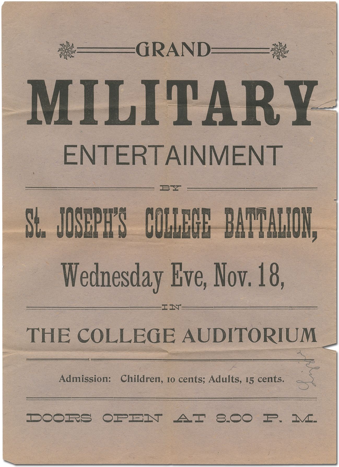 [Broadside]: Grand Military Entertainment by St. Joseph's College Battalion, Wednesday Eve, Nov. 18, in The College Auditorium