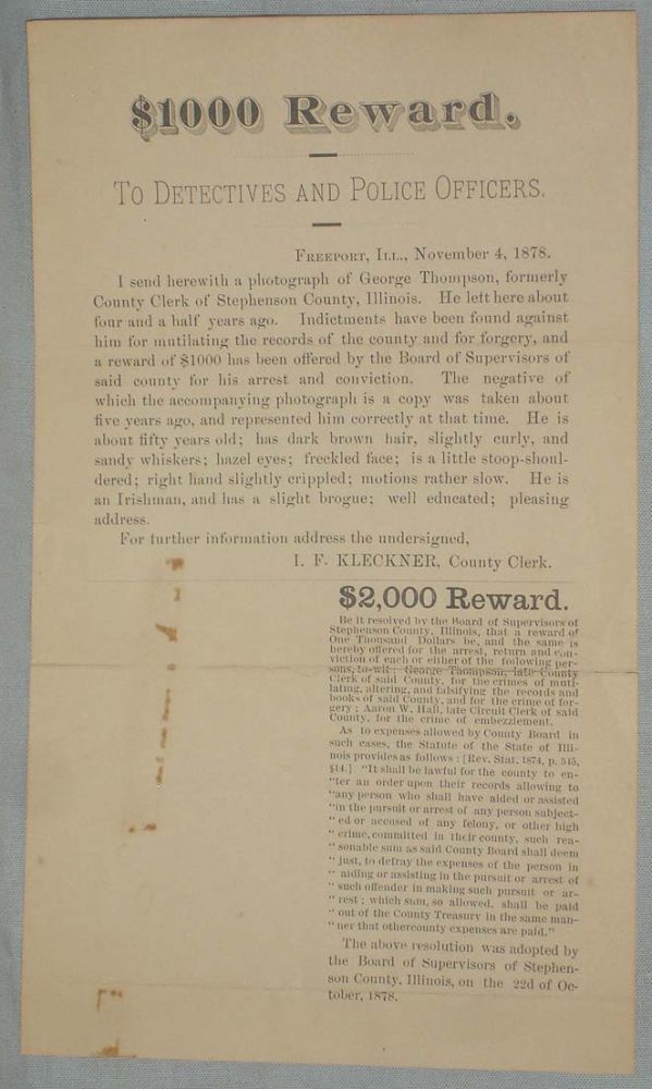 Freeport, Illinois, 1878. Broadsheet: I send herewith a photograph of George Thompson, formerly County Clerk of Stephenson Illinois. He left here about four and a half years ago. Indictments have been found against him for mutilating the records of the country and for forgery. He fled to Canada then ended up in California but eventually returned to Illinois where he was sentenced to State Prison.