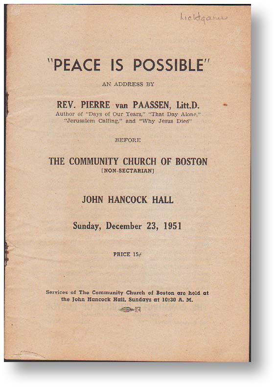 Peace is Possible" an Address by Rev. Pierre van Paassen [...] before The Community Church of Boston [...] Sunday, December 23, 1951