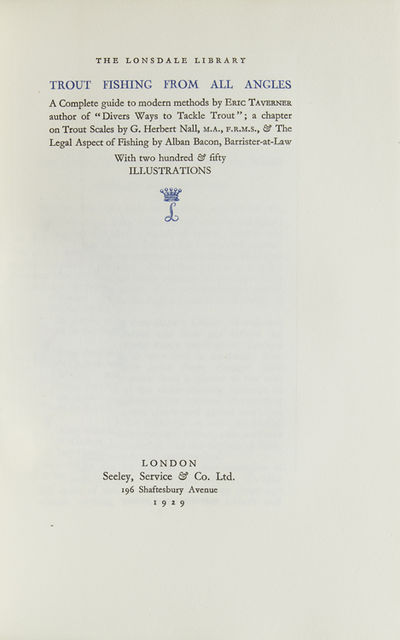 London: Seeley, Service & Co. Ltd, 196 Shaftesbury Street, 1929. First Edition, no. 197 of 375 copies, signed by the author. With 250 tipped-in half-tone illustrations from photographs and 30 hand-tied flies in mount on lower pastedown. 448 pp. 1 vols. 8vo. Original full blue morocco gilt, spine gilt, with arms of Lonsdale Library on upper board, t.e.g., fine. First Edition, no. 197 of 375 copies, signed by the author. With 250 tipped-in half-tone illustrations from photographs and 30 hand-tied flies in mount on lower pastedown. 448 pp. 1 vols. 8vo. Bruns T10; Litchfield, p. 86