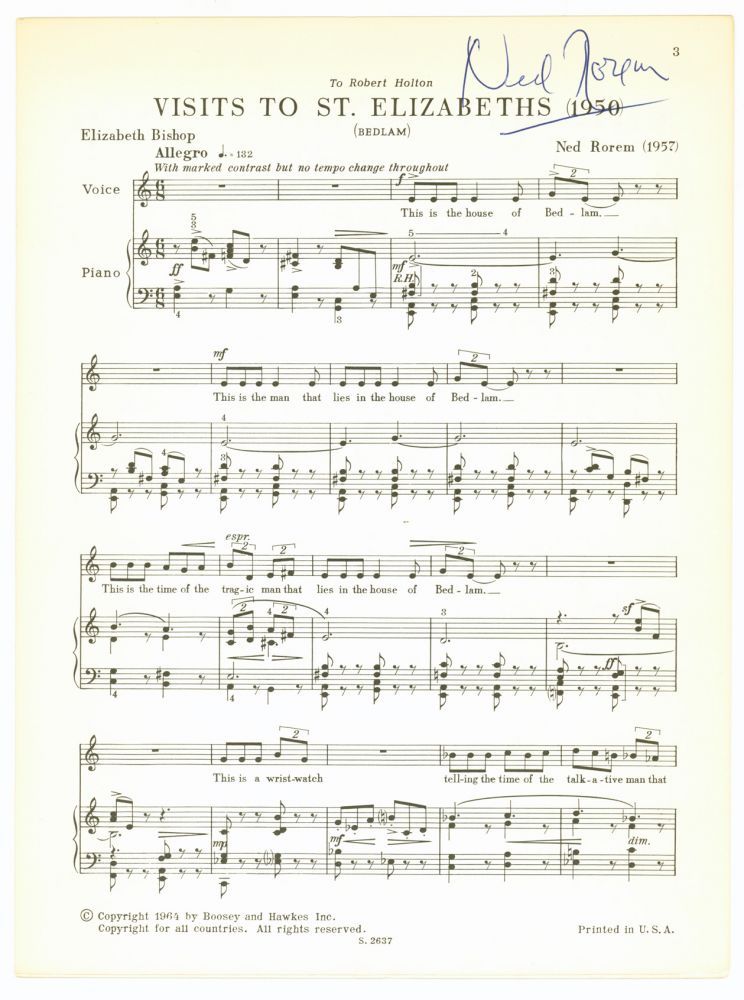 Visits to St. Elizabeths (1950) Bedlam). For Medium Voice and Piano. Music by Ned Rorem. Text by Elizabeth Bishop