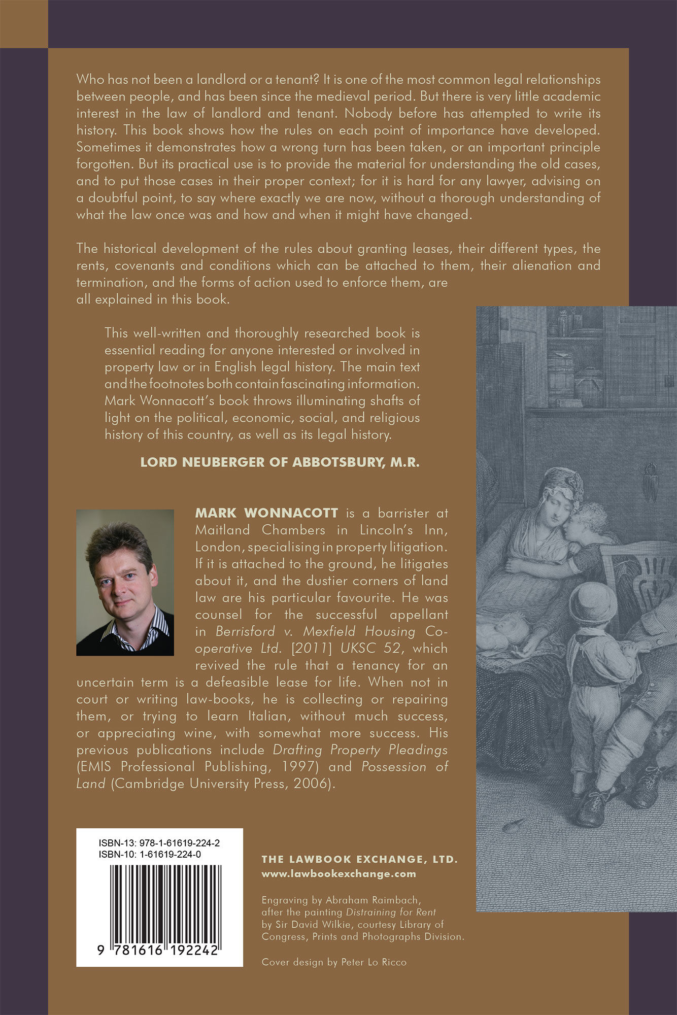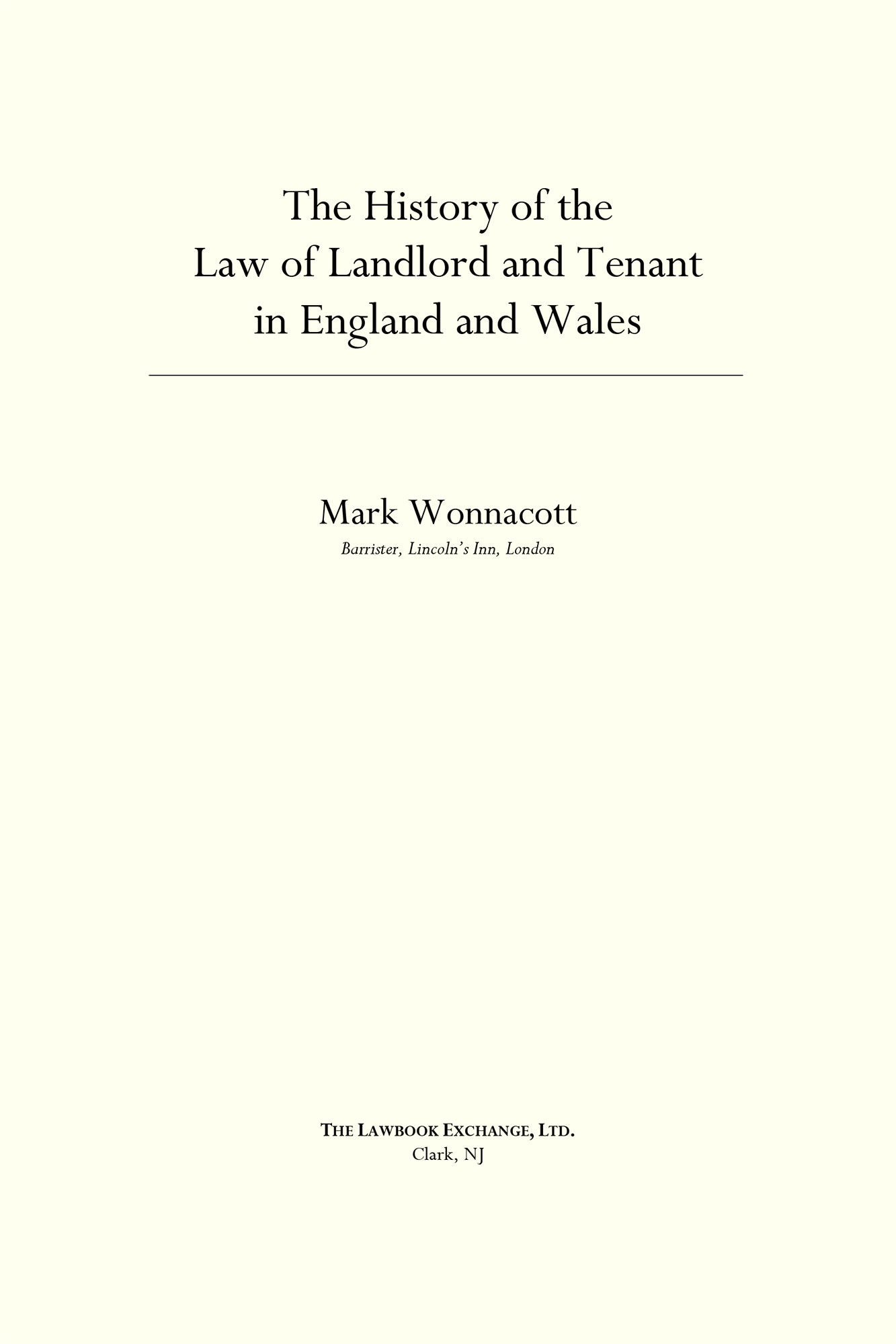 2013. ISBN-13: 9781616192242; ISBN-10: 1616192240. Wonnacott, Mark. The History of the Law of Landlord and Tenant in England and Wales. Clark: The Lawbook Exchange, Ltd., 2013. lvi, 363 pp. ISBN-13: 9781616192242; ISBN-10: 1616192240. Paperback. New. $65. * "This well-written and thoroughly researched book is essential reading for anyone interested or involved in property law or in English legal history. The main text and the footnotes both contain fascinating information. Mark Wonnacott's book throws illuminating shafts of light on the political, economic, social, and religious history of this country, as well as its legal history." --LORD NEUBERGER OF ABBOTSBURY, M.R. Who has not been a landlord or a tenant? It is one of the most common legal relationships between people, and has been since the medieval period. But there is very little academic interest in the law of landlord and tenant. Nobody before has attempted to write its history. This book shows how the rules on each point of importance have developed. Sometimes it demonstrates how a wrong turn has been taken, or an important principle forgotten. But its practical use is to provide the material for understanding the old cases, and to put those cases in their proper context; for it is hard for any lawyer, advising on a doubtful point, to say where exactly we are now, without a thorough understanding of what the law once was and how and when it might have changed. Mark Wonnacott is a barrister at Maitland Chambers in Lincoln's Inn, London, specialising in property litigation. If it is attached to the ground, he litigates about it, and the dustier corners of land law are his particular favourite. He was counsel for the successful appellant in Berrisford v. Mexfield Housing Co-operative Ltd. [2011] UKSC 52, which revived the rule that a tenancy for an uncertain term is a defeasible lease for life. When not in court or writing law-books, he is collecting or repairing them, or trying to learn Italian, without much success, or appreciating wine, with somewhat more success. Previous publications include Drafting Property Pleadings (EMIS Professional Publishing, 1997) and Possession of Land (Cambridge University Press, 2006).