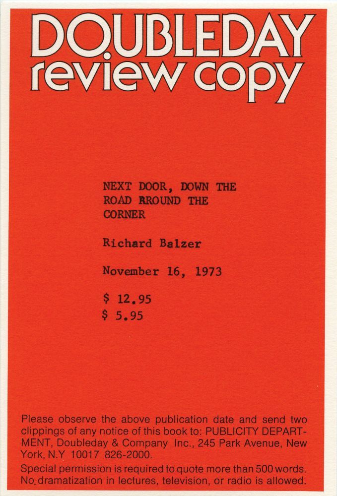 New York: Doubleday, 1973. First Edition. First Edition. Quarto. REVIEW COPY, with slip laid in. Also laid in are two original black-and-white photographs (4.5 x 6.5 inches) taken by Balzer, with his name stamped on the versos. The first is of a young girl standing in a doorway, sucking on her finger, and can be seen on page 61; the second represents an elderly couple lounging in a field of flowers, and can be seen on page 91.