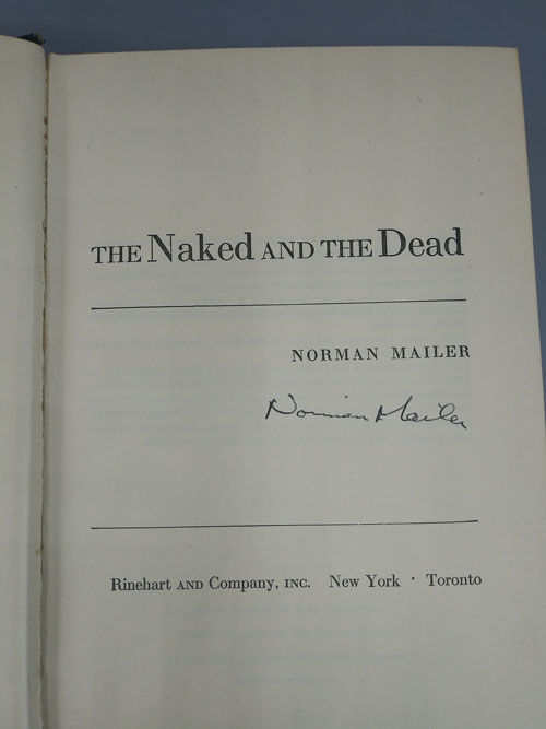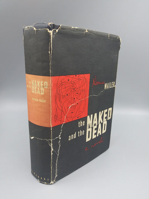 New York: Rinehart and Company, 1948. Later printing. Hardcover. Very good minus/fair. SIGNED. 721pp. Octavo [21.5 cm] Black textured paper covered boards with a white ink stamped title and 2 single ruled lines on the spine. The spine is rolled, and the edges of the spine and covers are abraded. There are several small splits in the backstrip at the foot. In a worn, price-clipped dust jacket, with 4 pieces of tape backing long tears in the front panel and the jacket's spine. Signed edition of the author's highly successful, and Pulitzer Prize winning, first book that was based on the author's own wartime experiences. Signed by Mailer on the title page.