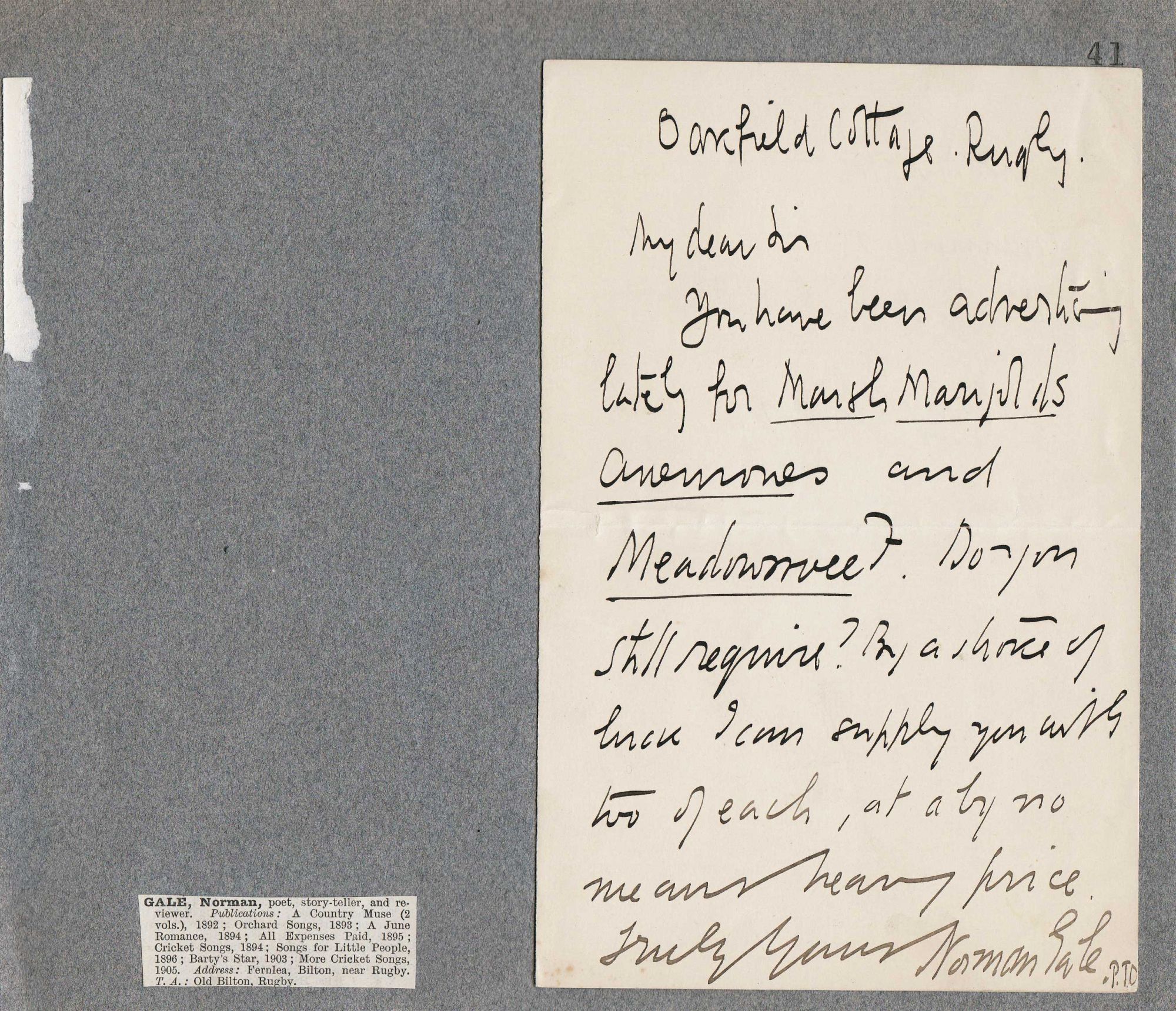 n.d.. Very Good. A short handwritten letter to an unknown recipient offering copies of three of his books for sale, including Marsh Marigolds and Anemones. He describes them as very clean and offers six books for 15 pounds. On folded 7 x 9 inch sheet which is affixed at the fold to a piece of grey cardboard. In very good condition. HAND/072613.