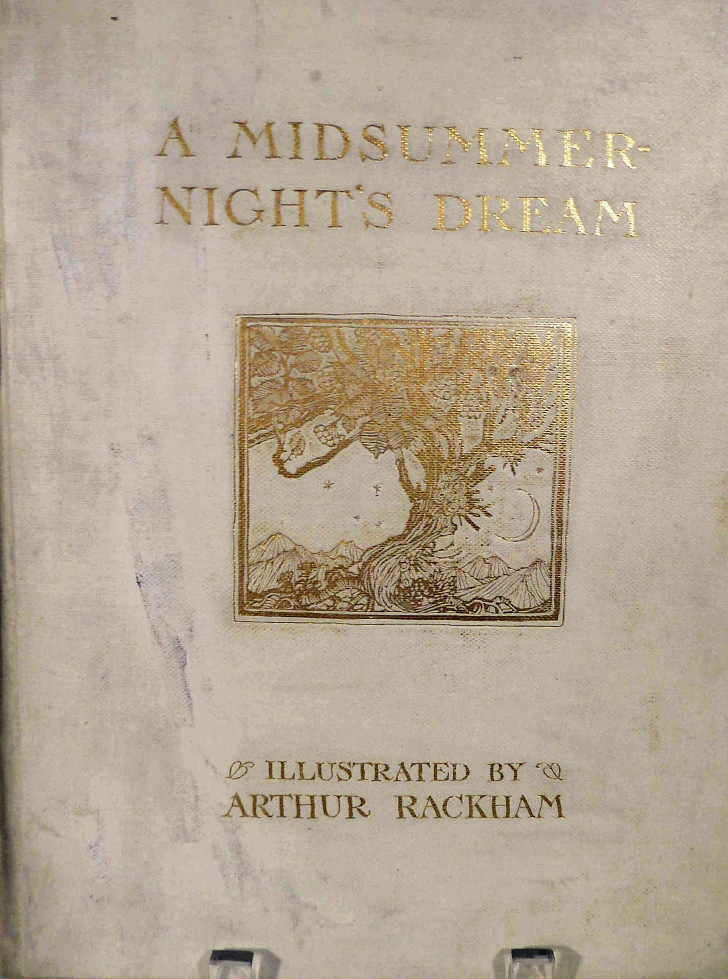 London & New York: William Heinemann & Doubleday, Page, 1908. hardcover. Orig. decorated cream colored cloth. Teg. Very good. 134 pages. 4to, 30 x 24 cm. Limited edition signed by Rackham with no limitation stated. Forty tipped-in full-page mounted color plates with lettered tissue guards, plus black and white illustrations in the text. "His interpretations of A MIDSUMMER NIGHT'S DREAM and WIND IN THE WILLOWS, for example, have become definitive, and continue to challenge later illustrators to find new approaches." [see: HAMILTON. p.9 "Arthur Rackham A Biography"]. Toning [approx. half centimeter fore-edge and foot] of title, front cover lightly soiled, lacks ties.