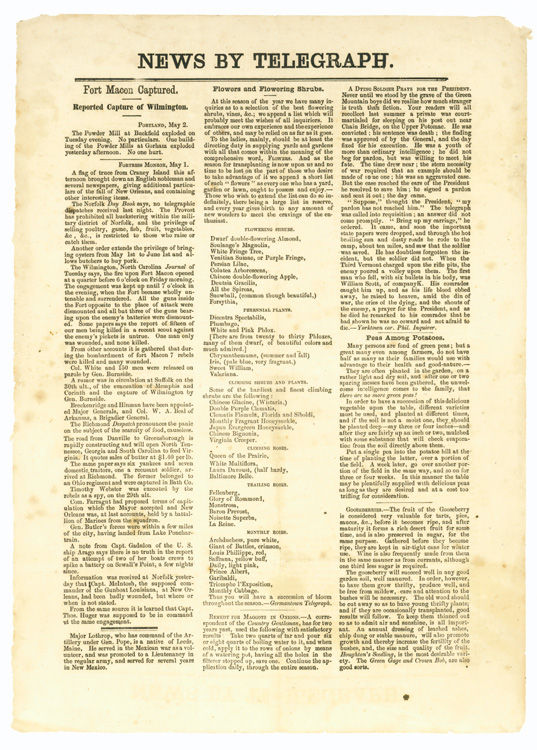 [Rockland, Maine: Rockland Gazette], 1862. Printed broadside in three columns. 13 x 9-1/4 in. Old folds, else fine. Printed broadside in three columns. 13 x 9-1/4 in. Broadside reporting events of the Civil War, including the surrender of Fort Macon, N.C., General Butler's advance on New Orleans, and an unfounded report on the fall of Wilmington (it would not be captured until 1865). The remainder of the broadside concerns gardening and farming matters. Attributed to the Rockland [Maine] Gazette based on the similarity to the type faces and layout of the 1861 Rockland Gazette broadside “Important News by Telegraph.” There is also news here from Buckfield and Gorham, Maine and news of Major Lothrop of Leeds, Maine.