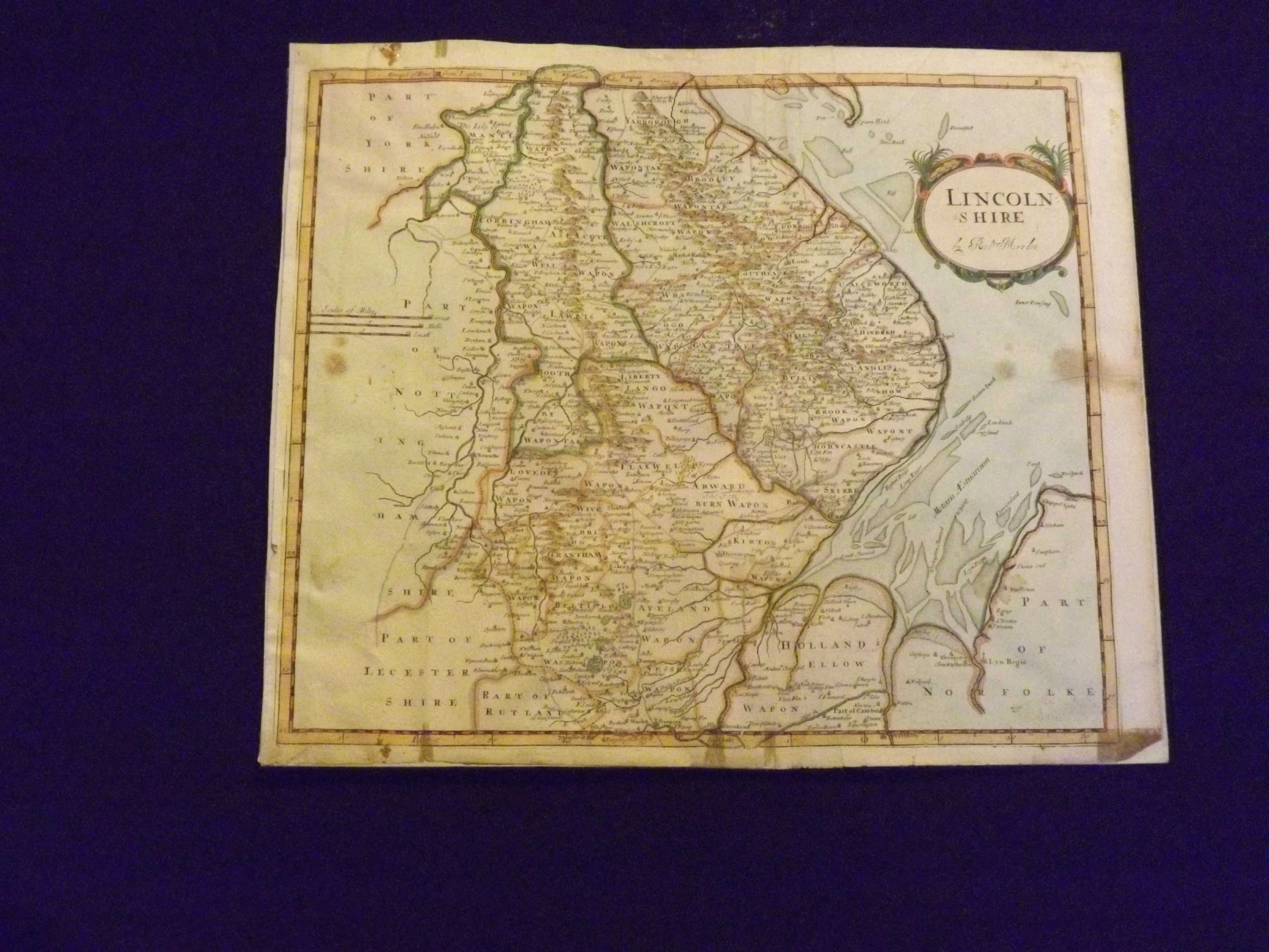Hand colored, simple cartouche, 17" x 15". Map laid down on cardboard backing, some foxing, soiling and staining, corner lower right hand margin with some tape discoloration, and slightly chipped in that margin, but not affecting image, tape may have been used to lay down map in places; despite imperfections a presentable map. Sold as is. Robert Morden (d1703) was a mapmaker that is first documented in 1668 trying to put up a building in Cornhill after the great fire in London. He is best known for the county maps featured in a new edition of Camden's Britannia that was produced by Edmund Gibson. These maps appeared in at least four editions. While hindered by a low survival rate, Morden also produced a number of attractive larger maps of London, Essex and some early maps of the American colonies. ODB.
